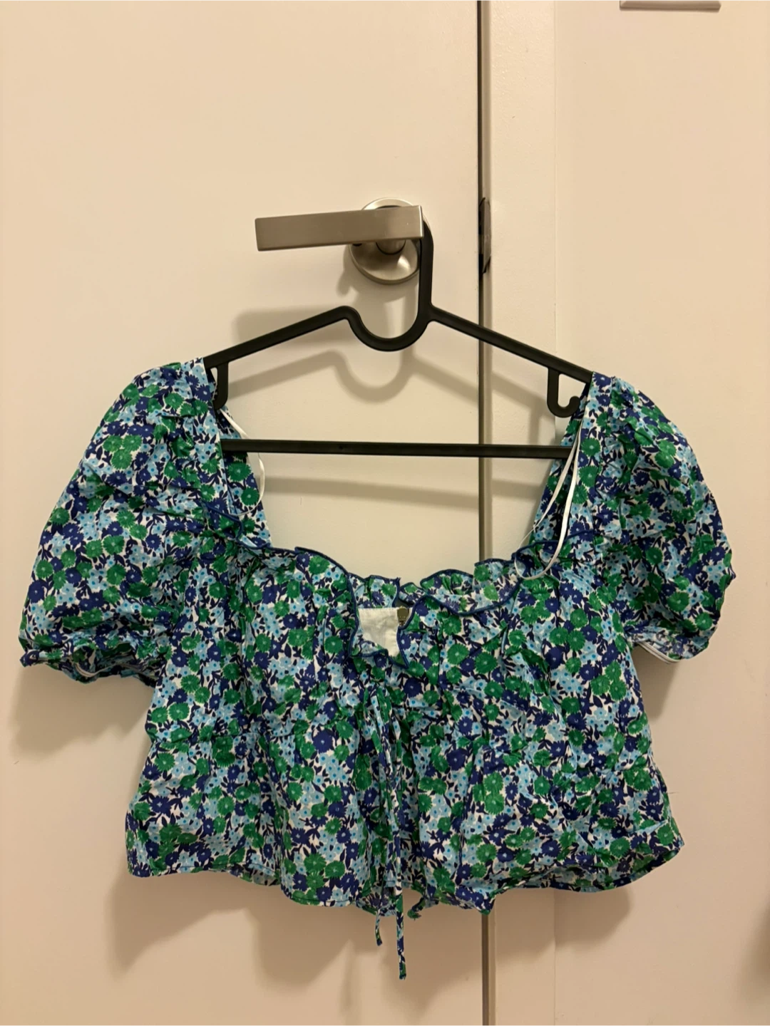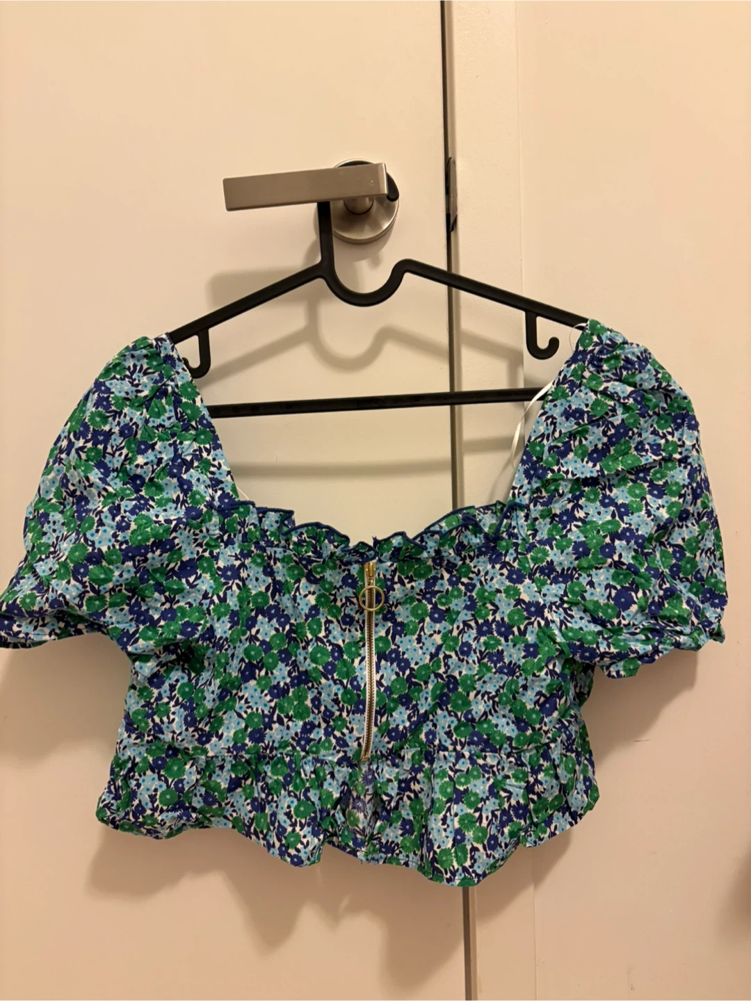 This is a Zara floral print puff sleeve top in size M. It features a blue and green floral pattern. Perfect for adding a pop of colour to your wardrobe!