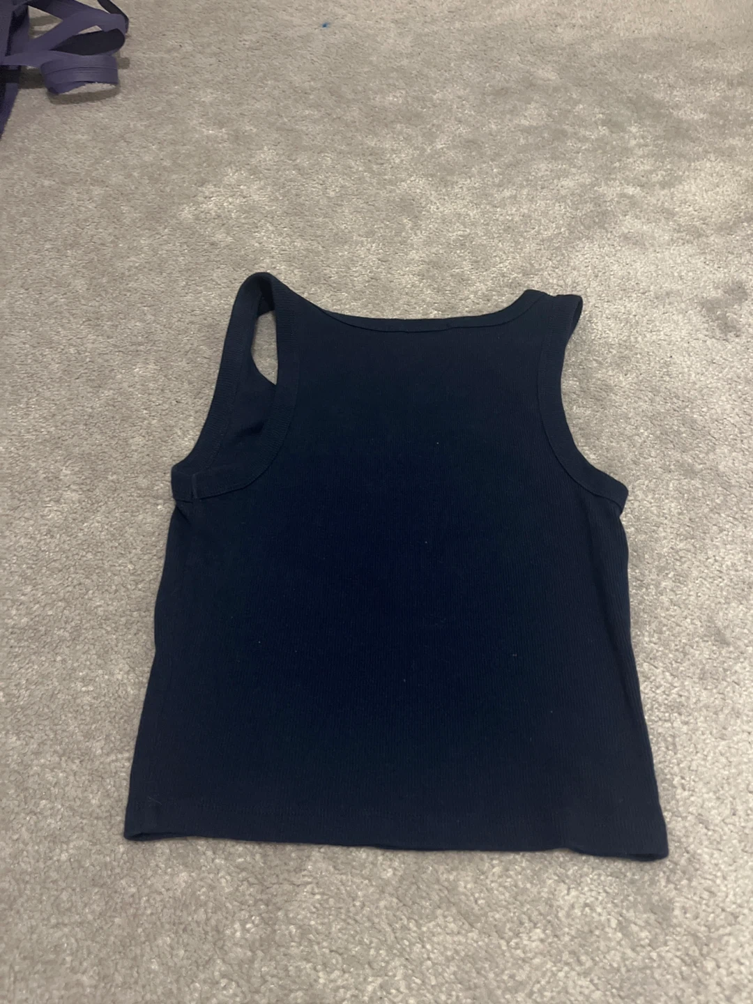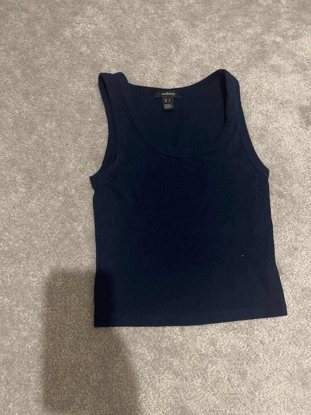 Navy ribbed tank top from ambiance. It's a size XS. The material is a cotton blend.