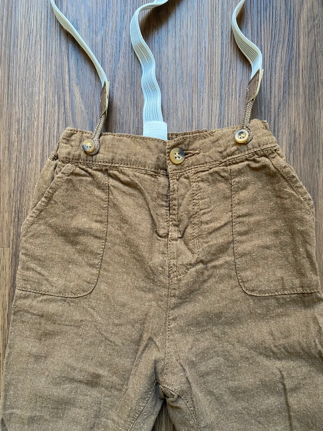 H&M brown pants with adjustable suspenders. Size is 92 (1.5-2Y). These pants are made for a toddler. Lined, adjustable waist with removable suspenders. Worn once or twice.