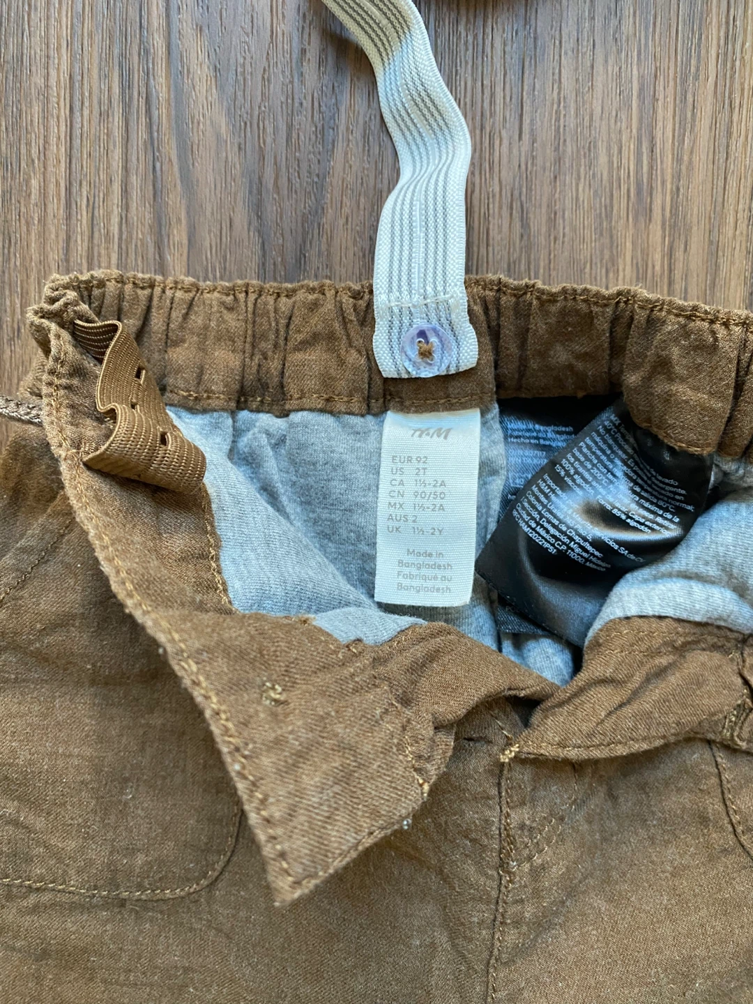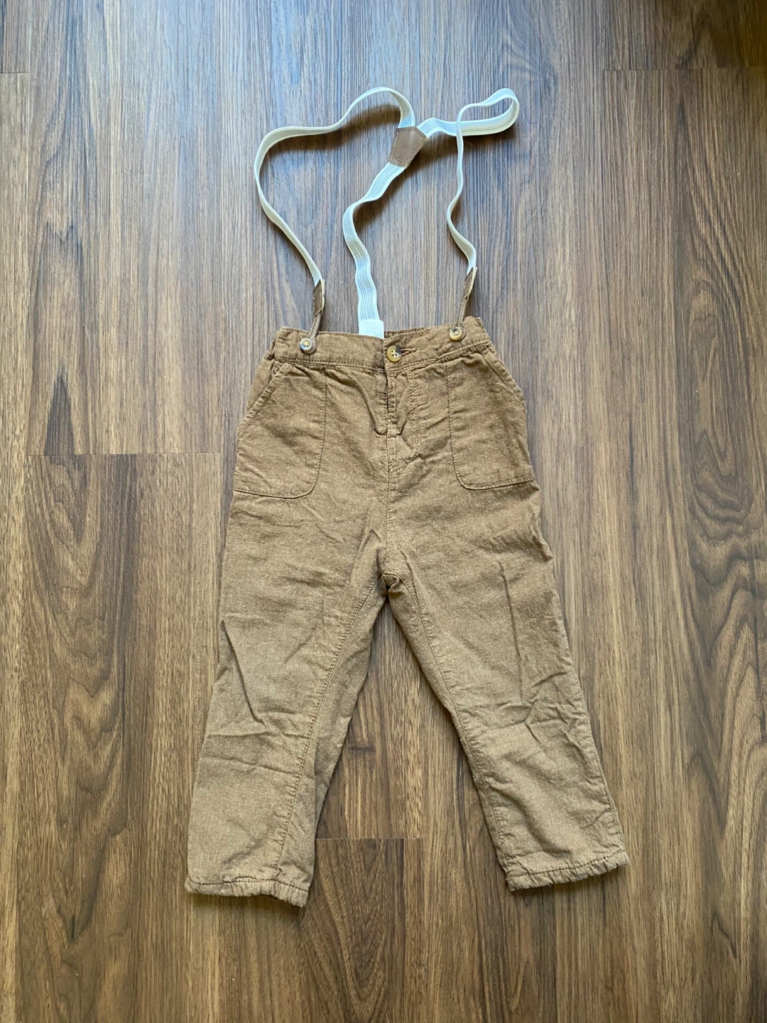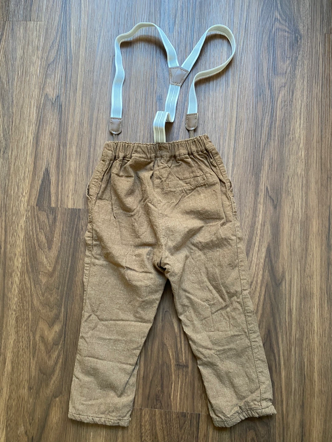 H&M brown pants with adjustable suspenders. Size is 92 (1.5-2Y). These pants are made for a toddler. Lined, adjustable waist with removable suspenders. Worn once or twice.
