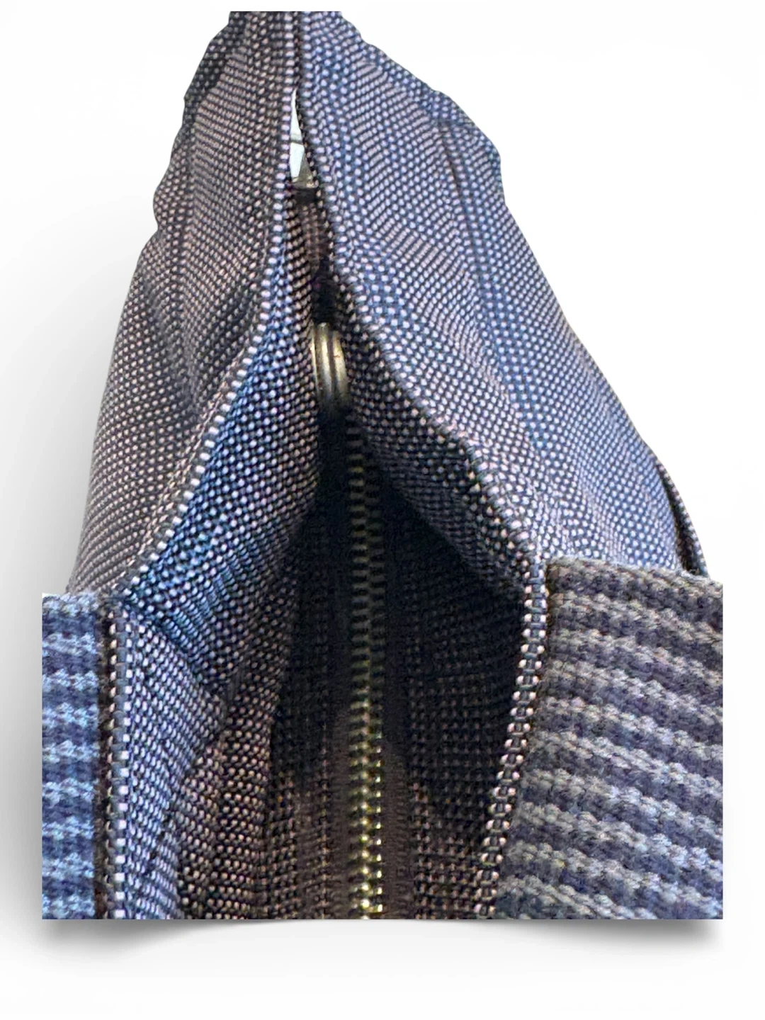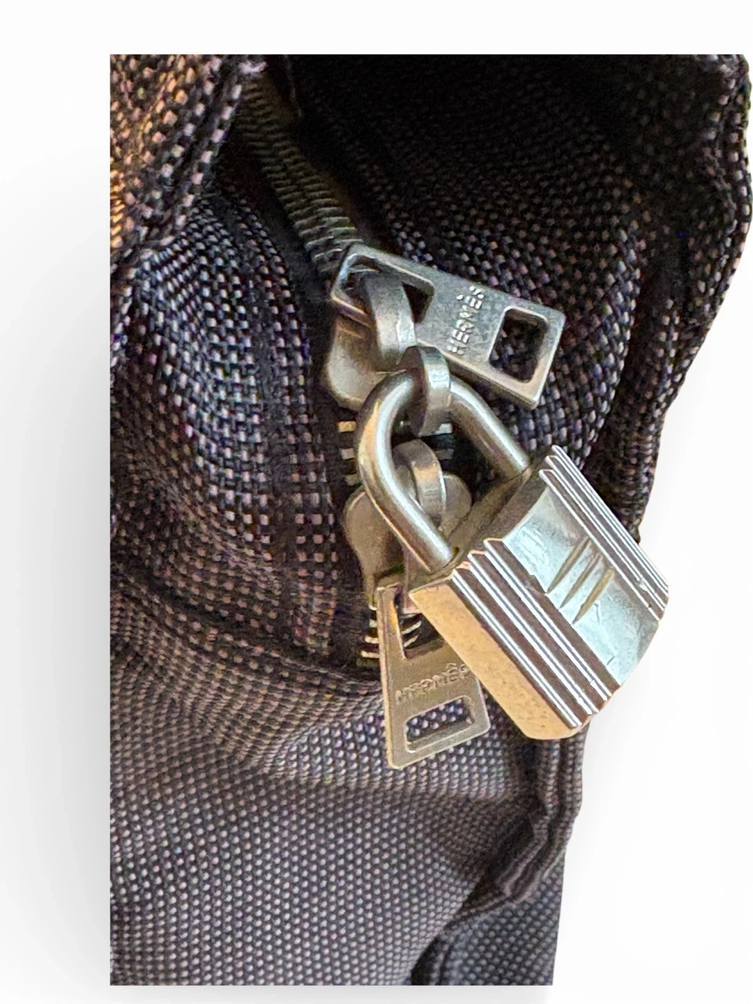 Stylish Hermès tote bag made from durable fabric. It features a secure zippered closure with a lock and key set. This bag is perfect for everyday use.