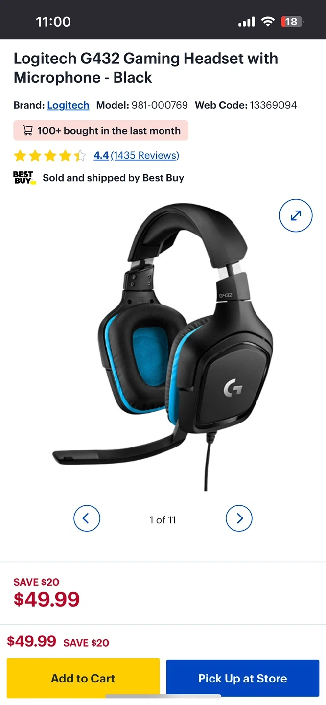 Logitech G432 7.1 Surround Gaming Headset in black. It's wired with a 3.5 mm audio jack and a swivel-to-mute microphone. This headset connects to PC, PS4, Xbox One, and Nintendo Switch.