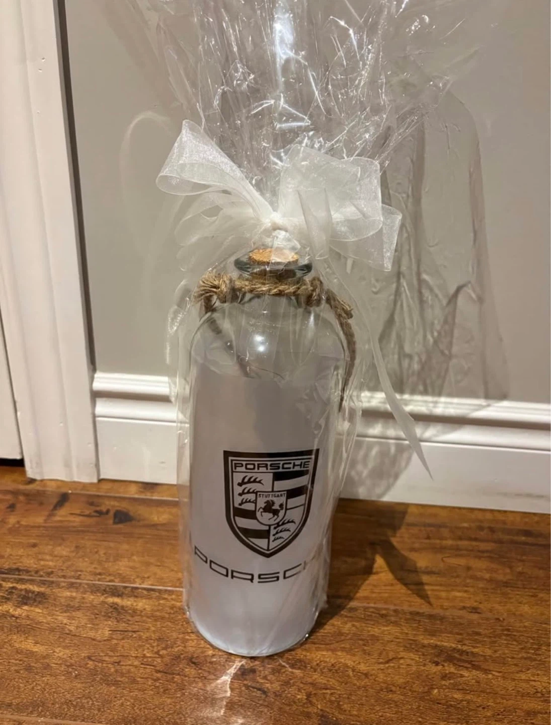 This is a Porsche Stuttgart decor lamp. It's housed in a decorative glass bottle with a twine accent. Perfect for a car enthusiast's home!