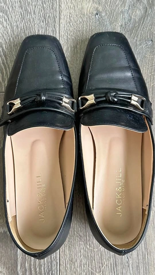 Stylish Jack & Jill black loafers with a gold buckle detail on top. Super comfy for everyday wear or dressing up a bit. Women’s size 240mm (about US 7). Best fit for US size 6.5–7 depending on the brand.