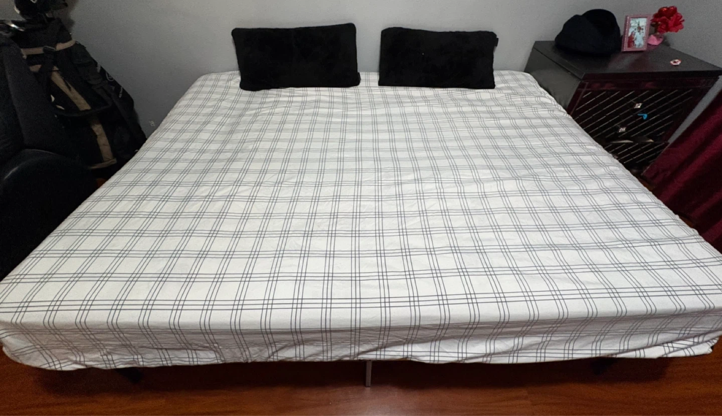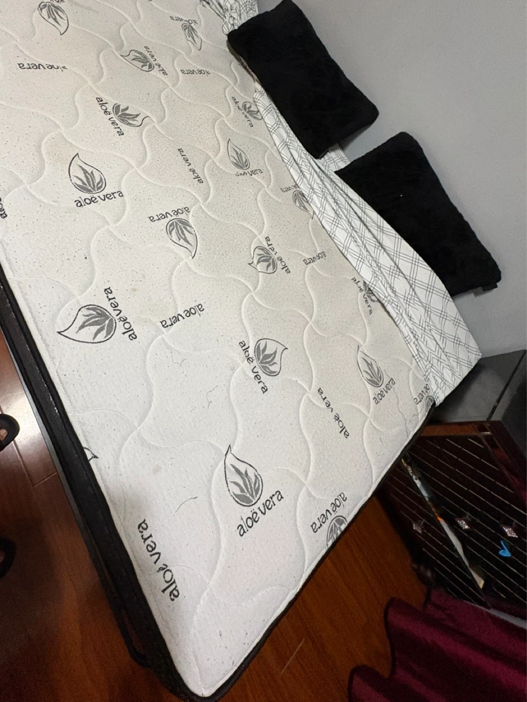 This is a queen size bed frame with an Aloe Vera mattress. The frame is made of sturdy black metal and is easy to assemble. It includes the mattress and frame, ready for your bedroom. Perfect for anyone needing a complete queen bed setup!
