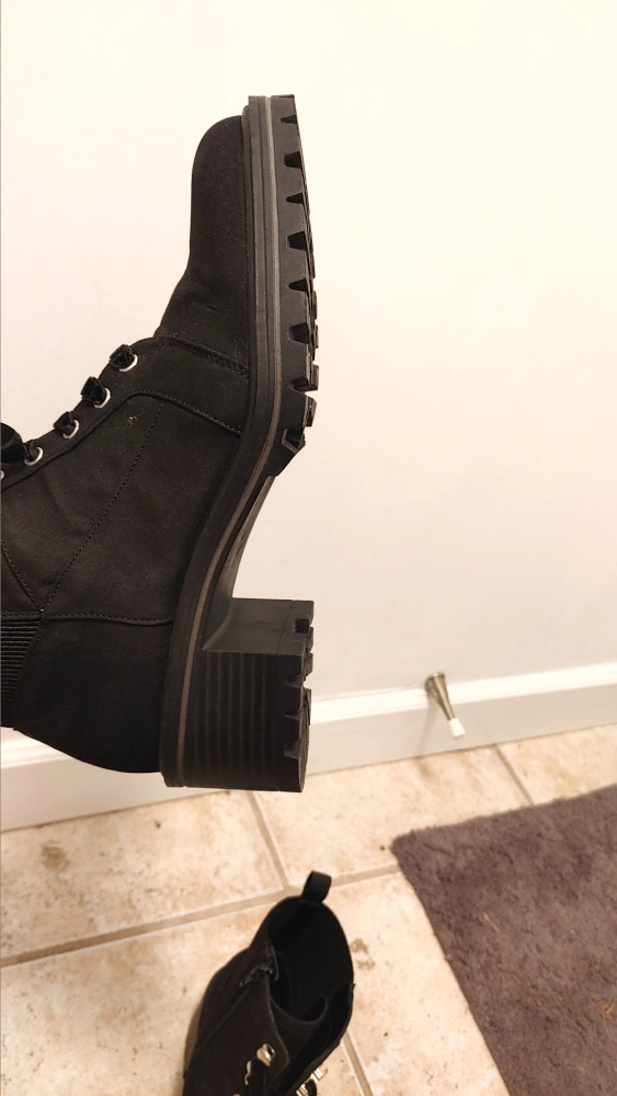 These black combat boots feature a lace-up front and a convenient side zipper for easy wear. The chunky heel and lug sole add a stylish touch.