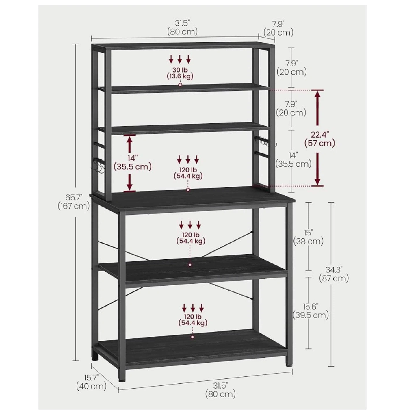 This VASAGLE baker's rack provides ample storage for your kitchen. It features a large worktop with dimensions 31.5" W x 15.7" D, plus multiple shelves. The sturdy metal frame is dark grey.