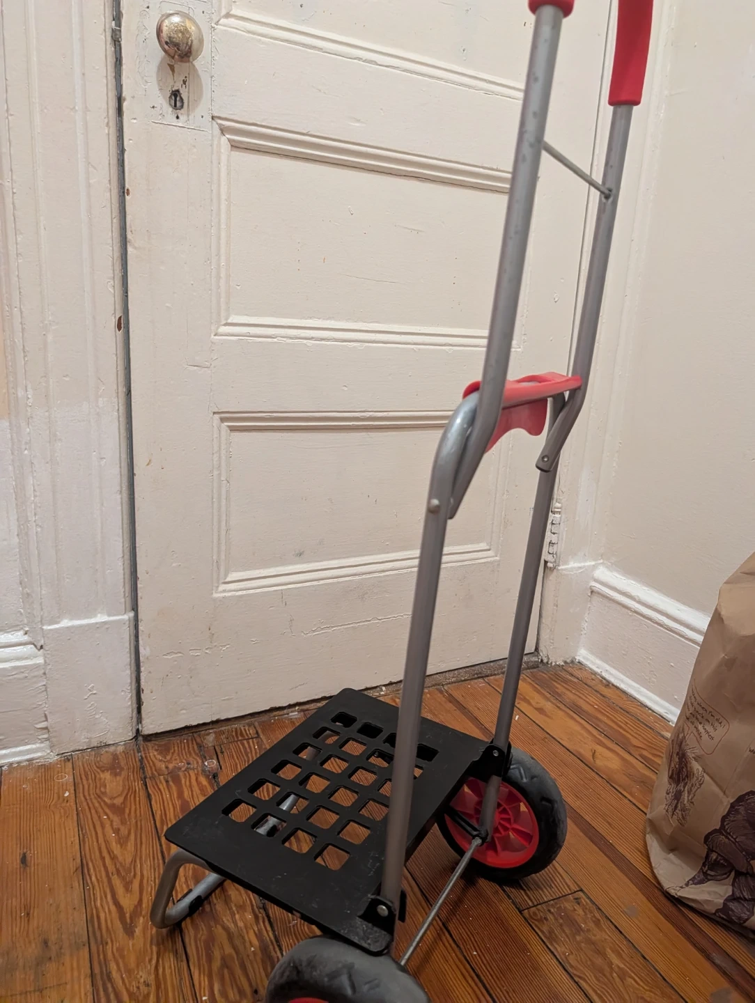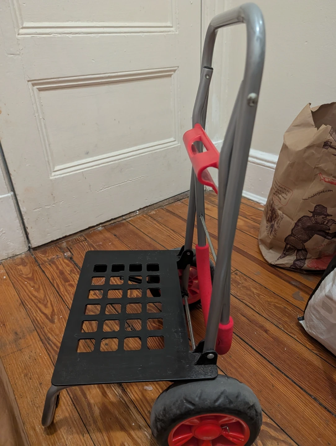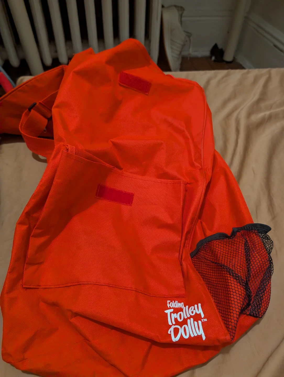 This Folding Trolley Dolly is a great way to transport groceries or laundry. It's a lightweight and portable cart that can hold up to 110 lbs. The bag is red and features a mesh side pocket. It folds flat for easy storage.