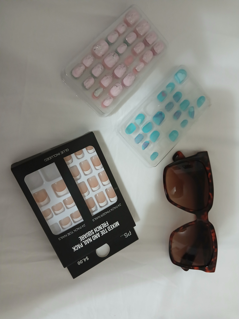 Selling a set of PS... mixed toe and nail packs in the French Square style! Each pack includes 24 finger nails and 24 toe nails, plus glue is included. Originally priced at $4.00