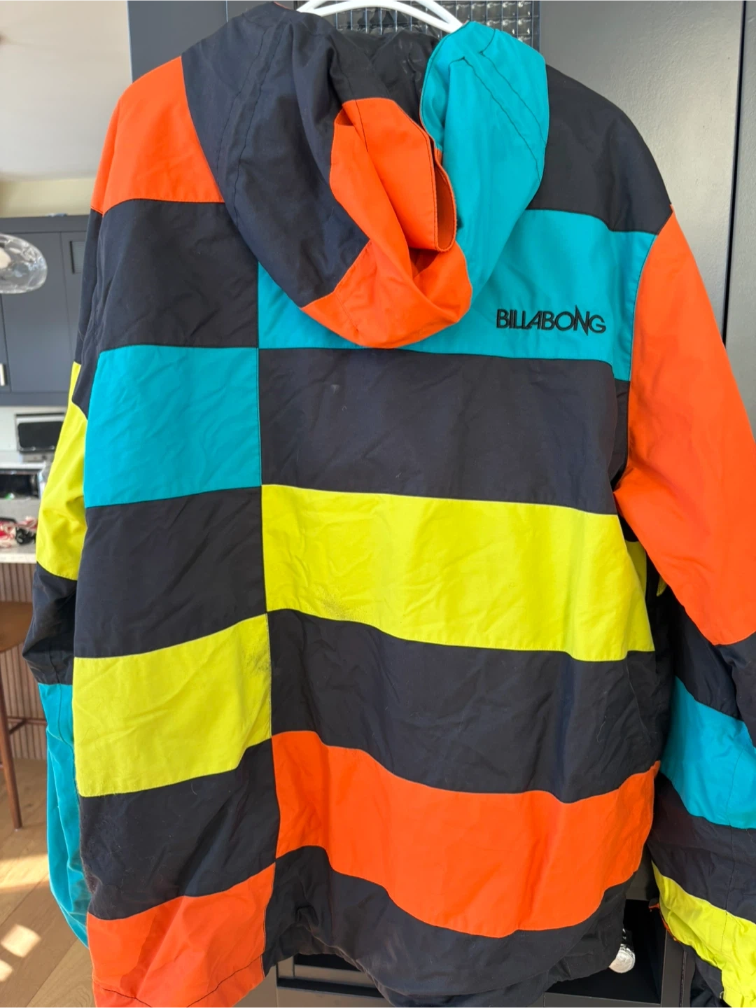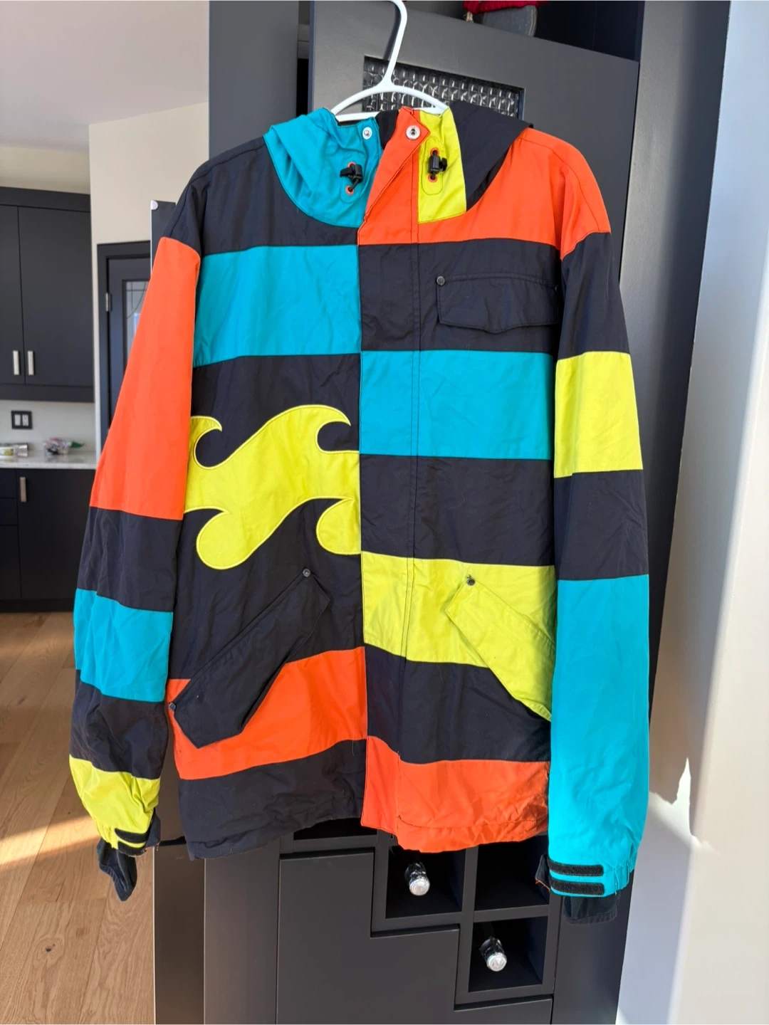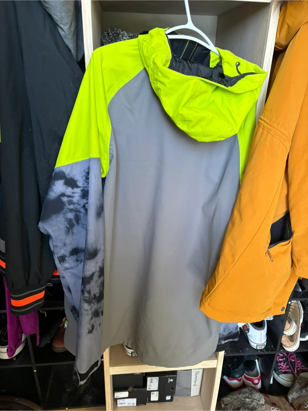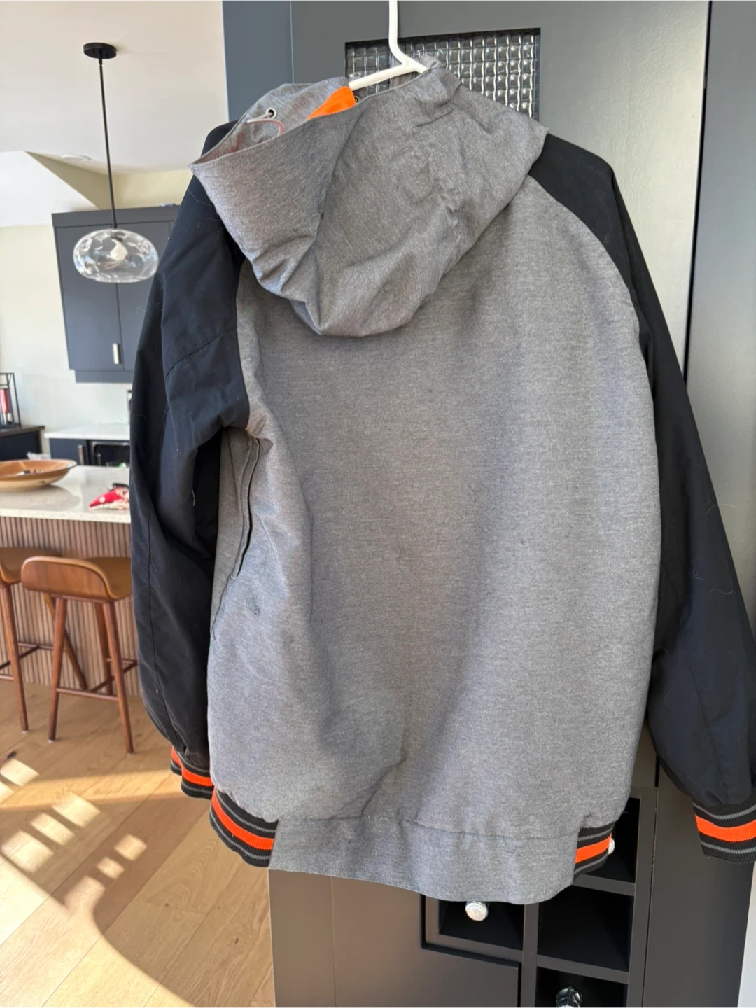 Grey and black DC Shoes snowboard jacket with orange accents. Features a hood and multiple pockets. Perfect for hitting the slopes this season!