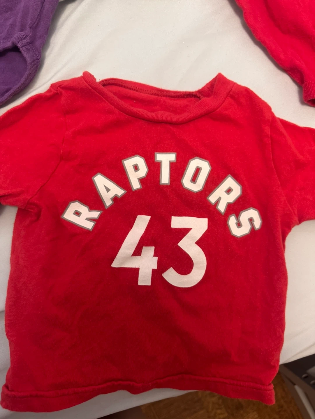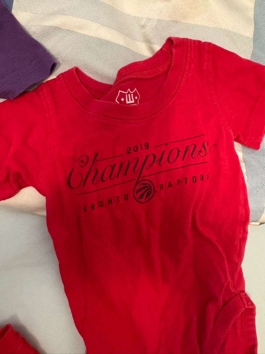 Three Toronto Raptors baby items: a red 'Champions 2019' bodysuit, a purple Raptors logo bodysuit, and a red Raptors jersey-style t-shirt. Cotton blend fabric. $10 each OBO for all 3. Onesies are 6M & the Siakam shirt is 12M