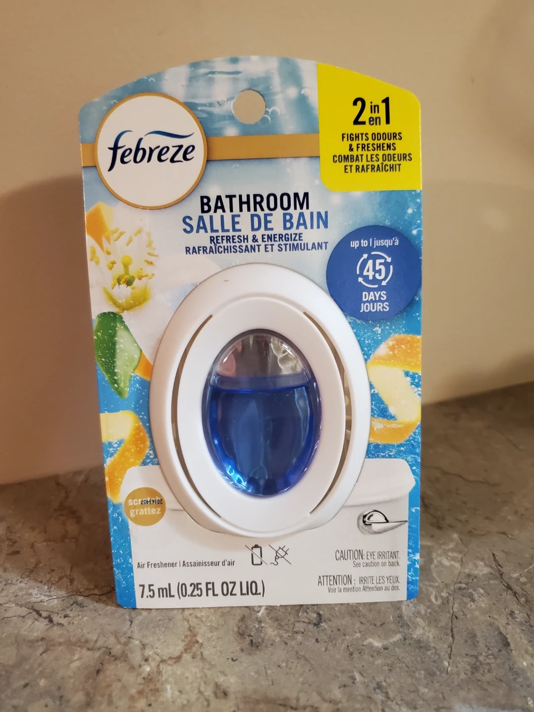 This Febreze bathroom air freshener fights odours and refreshes. It's a 2-in-1 refresh and stimulate scent. Lasts up to 45 days.