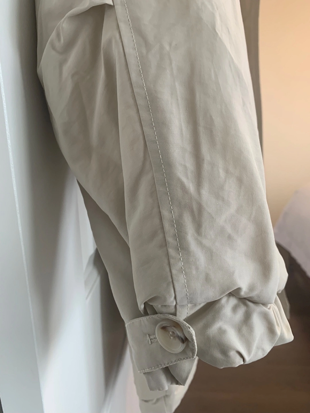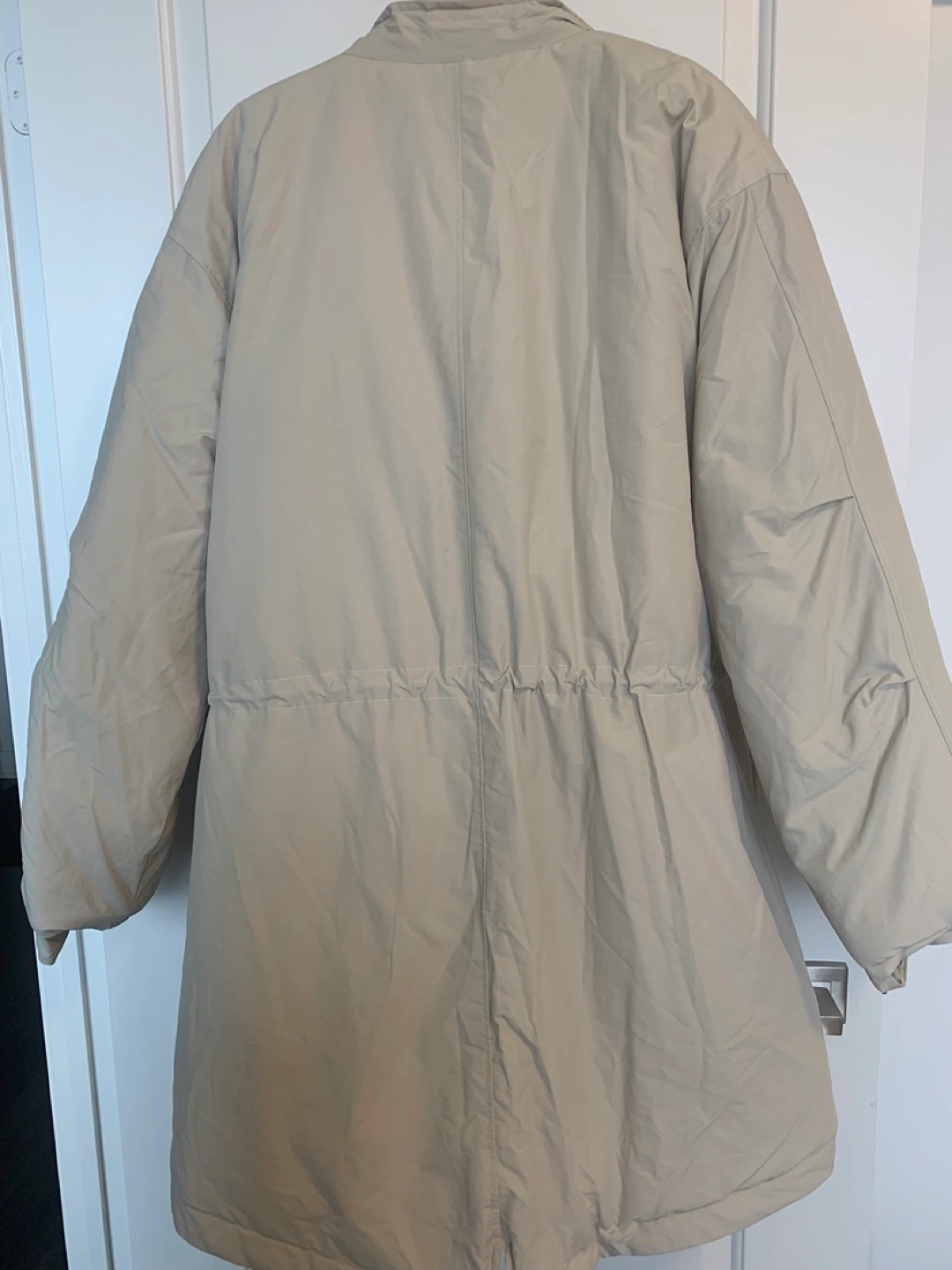 The perfect coat for cold weather. Features a zipper closure, buttons, pockets, and a drawstring in the back. The coat has long sleeves.