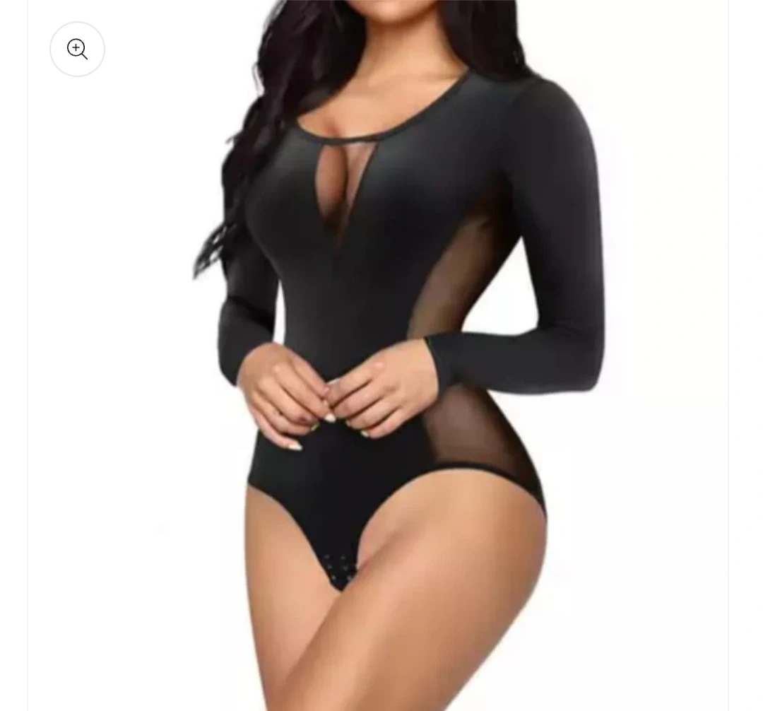 Selling a black long sleeve bodysuit. It features a mesh detail on the sides and a keyhole cutout at the chest. Perfect for a night out!