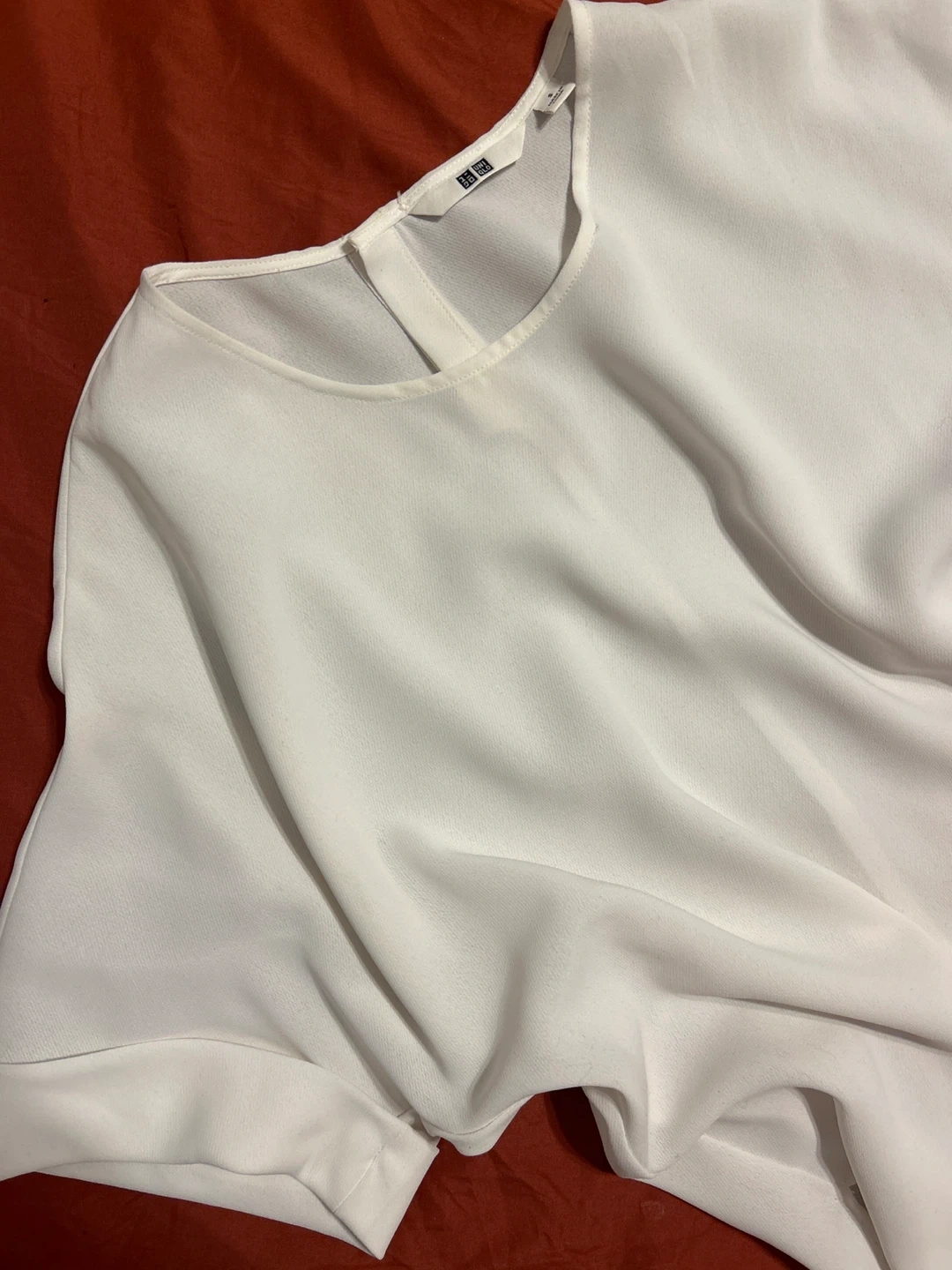 This is a white tunic top from Uniqlo. It's made of a lightweight, flowy material. It has a rounded neckline and a back closure.