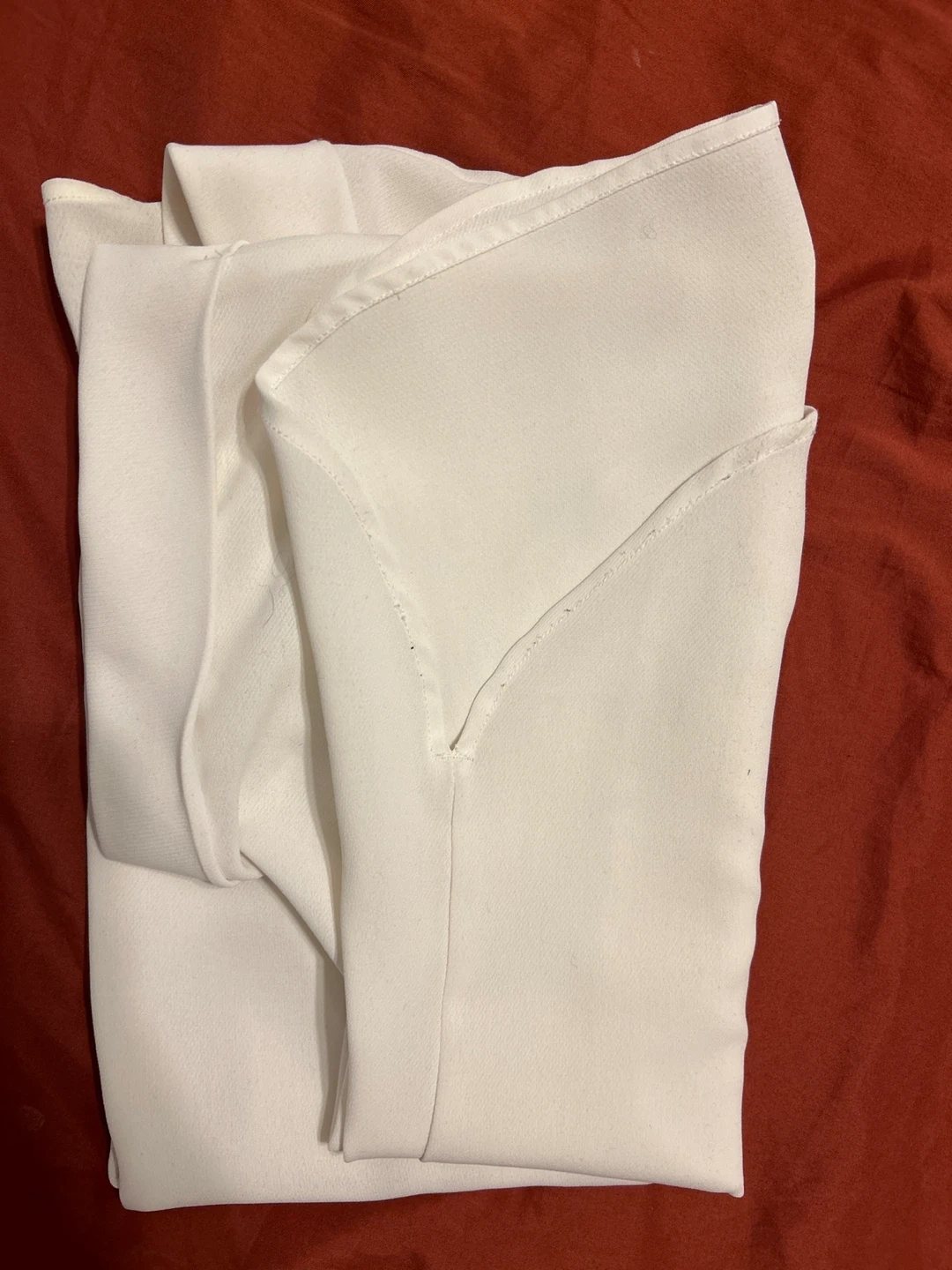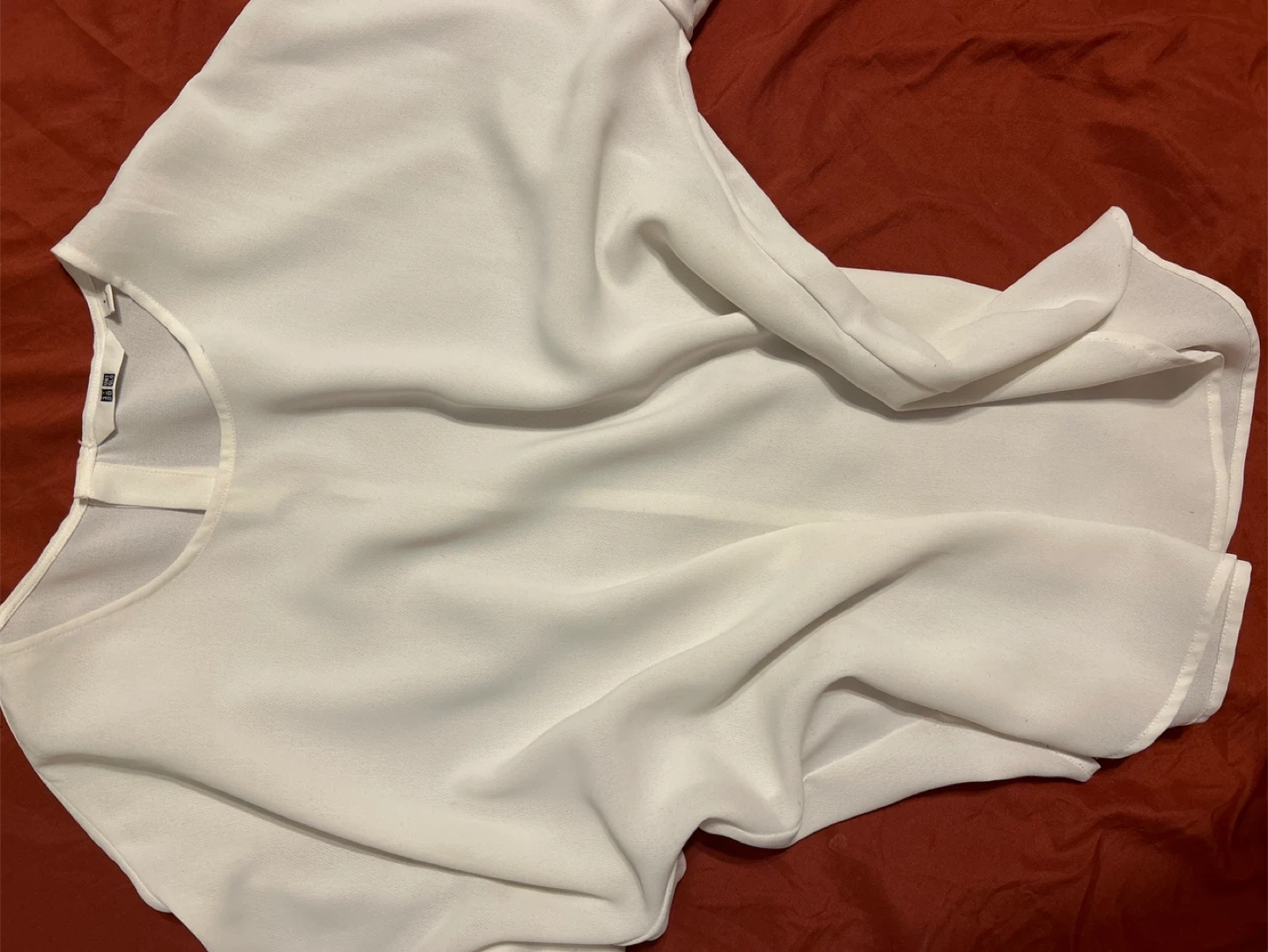 This is a white tunic top from Uniqlo. It's made of a lightweight, flowy material. It has a rounded neckline and a back closure.