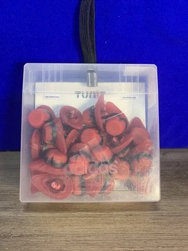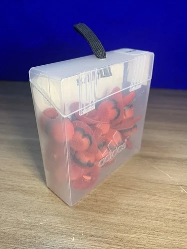 Authentic Adidas F50 TUNIT Traxion® Hard Ground Studs Set, designed for firm and artificial pitches. This kit is brand new and unused, still sealed in its original Adidas hard plastic carrying case with a handle strap. Includes: 12 x 10mm studs, 8 x 13mm studs. Material: Thermoplastic Polyurethane (TPU) & Nylon. Color: Silver with red base rings. Condition: 100% Brand New – Never Used. Engineered for hard and very hard natural or artificial surfaces. Wear Indicator (Black Thread) shows when studs need replacement. Designed for maximum stability, grip, and comfort. Compatible with 6- or 8-stud configurations. Durable TPU and nylon materials. Compact and stylish storage case.