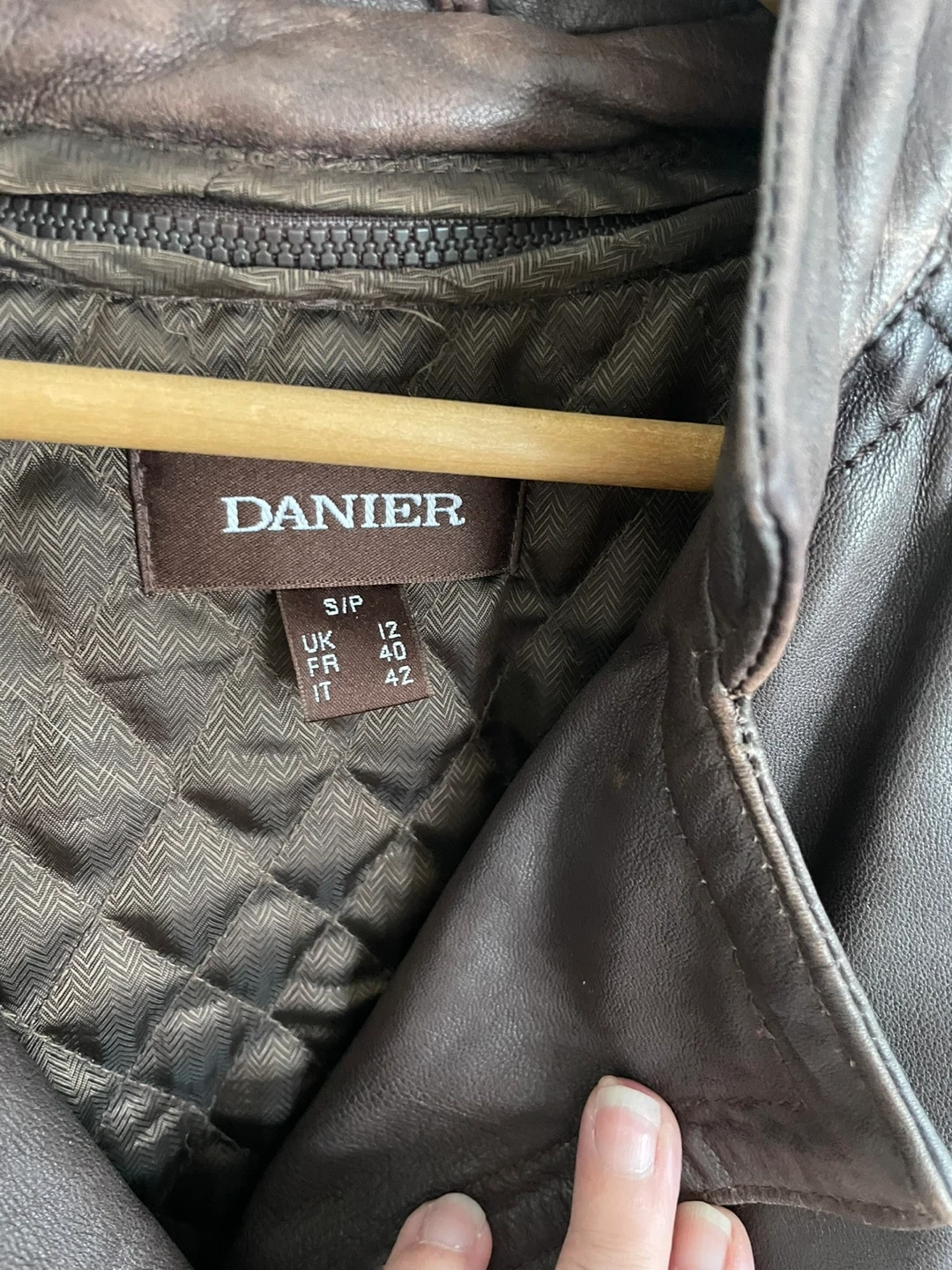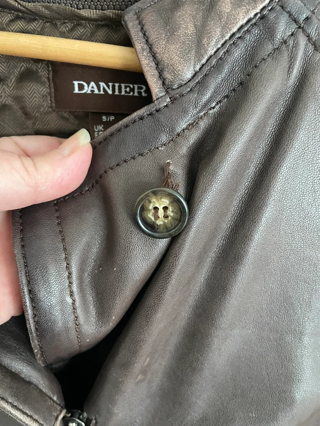 Brown leather jacket from Danier. Features a zip-up front and button detailing on the cuffs. This jacket is sized S/P, UK 12, FR 40, and IT 42. It's a stylish piece for cooler weather!
