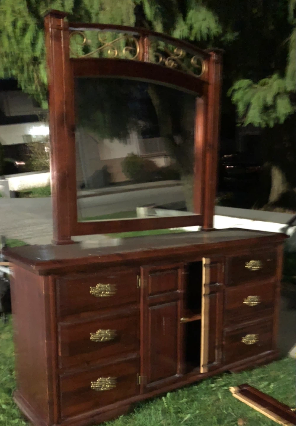 Dark wood dresser with mirror and ornate detailing. Features multiple drawers and cabinet space for storage. Wood construction.