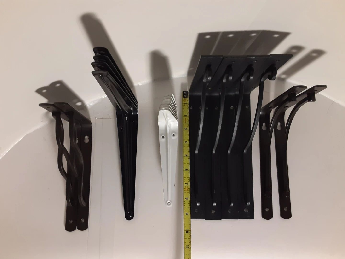 Selling a variety of decorative and non-decorative shelf brackets. Includes ornate black metal brackets and simpler black and white L-shaped brackets. They're great for adding stylish shelving to any room. Metal construction, all in good to excellent condition, some have signs of light use.