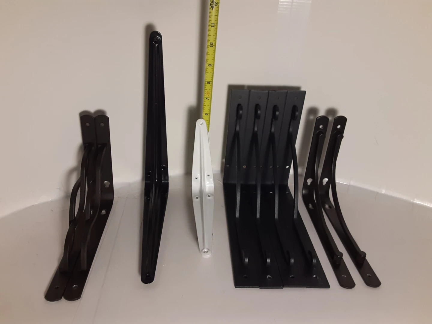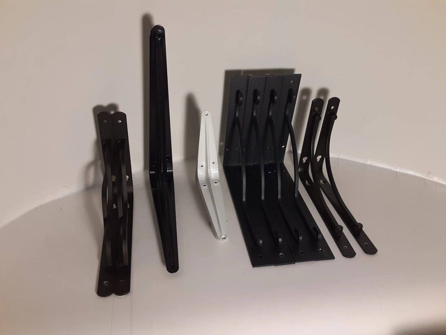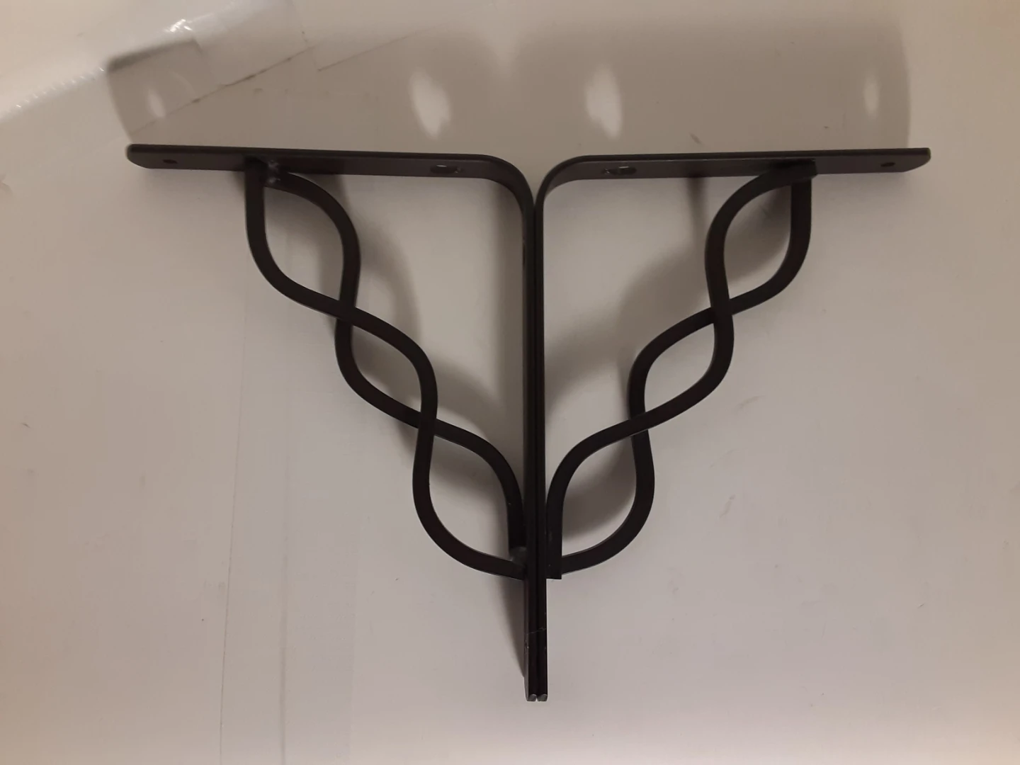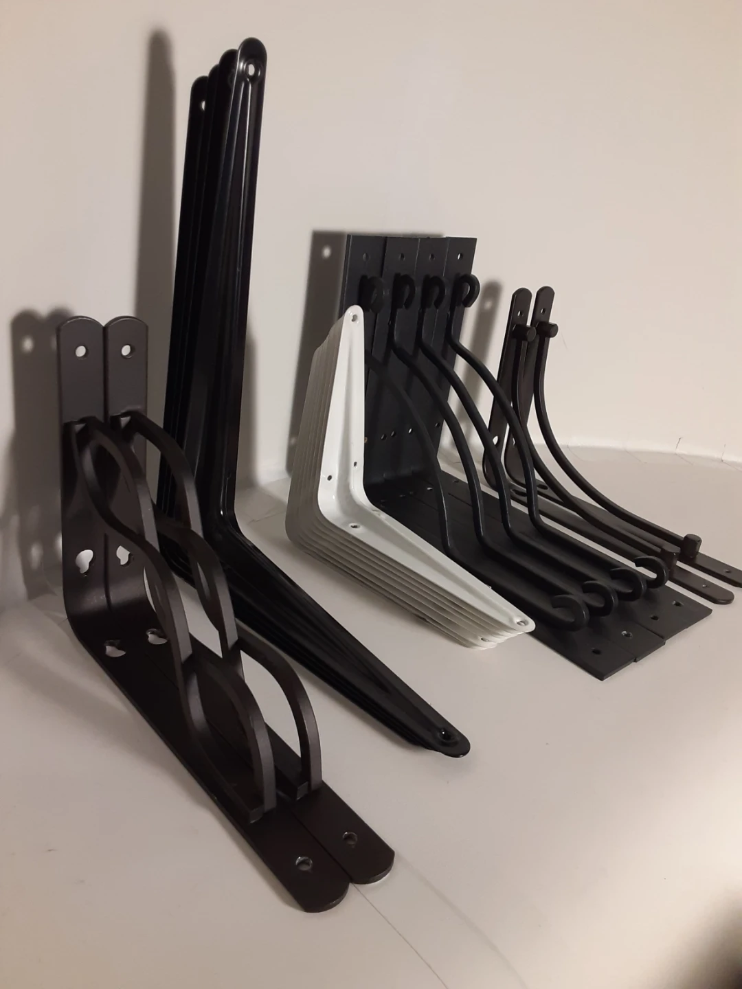 Selling a variety of decorative and non-decorative shelf brackets. Includes ornate black metal brackets and simpler black and white L-shaped brackets. They're great for adding stylish shelving to any room. Metal construction, all in good to excellent condition, some have signs of light use.