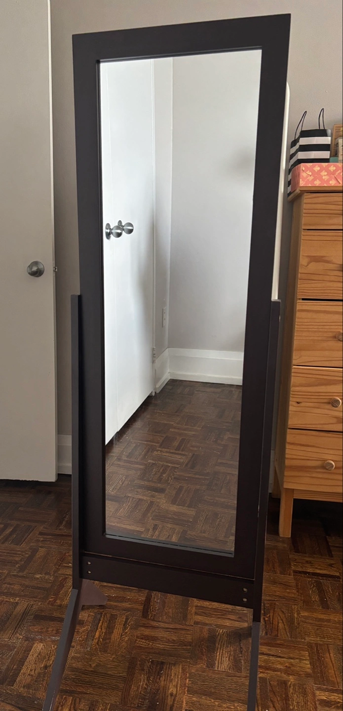 Selling a full-length standing mirror! It's in great shape and ready to brighten up your space. The frame is a dark colour! Perfect for bedrooms, dressing rooms, or anywhere you need a good look at your outfit