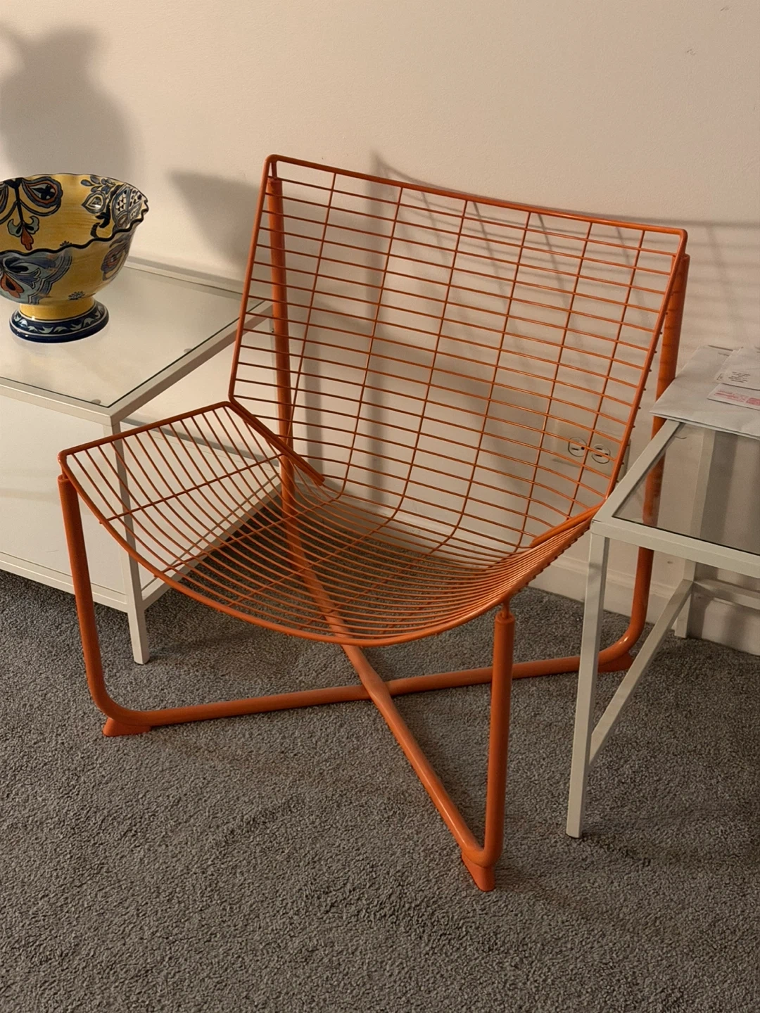Retro metal wire lounge chair in a bright orange finish. It's made from durable metal wire with a supportive frame. This chair's open design makes it a stylish accent piece for any room! Purchased from IKEA!