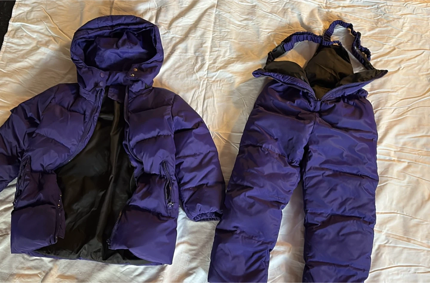 This is a purple puffer snowsuit for kids. It includes a hooded jacket and insulated overalls. Keep your little ones warm and dry during winter play!