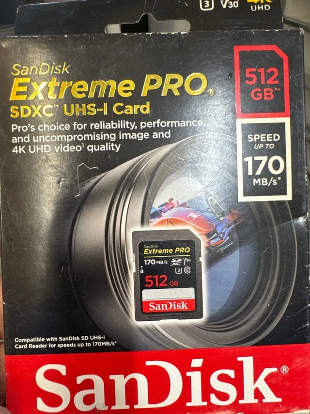 I'm offering a SanDisk 512GB Extreme PRO SDXC UHS-I Card, perfect for high-resolution photography and 4K UHD video recording. This card offers pro-level performance for reliability and speed, ensuring you never miss a moment. This item is new, still in the original packaging. Capacity: 512 GB, Type: SDXC UHS-I Card, Speed: Up to 170 MB/s. Ideal for 4K UHD video and high-resolution content. If the ad is still up, the card is still available!