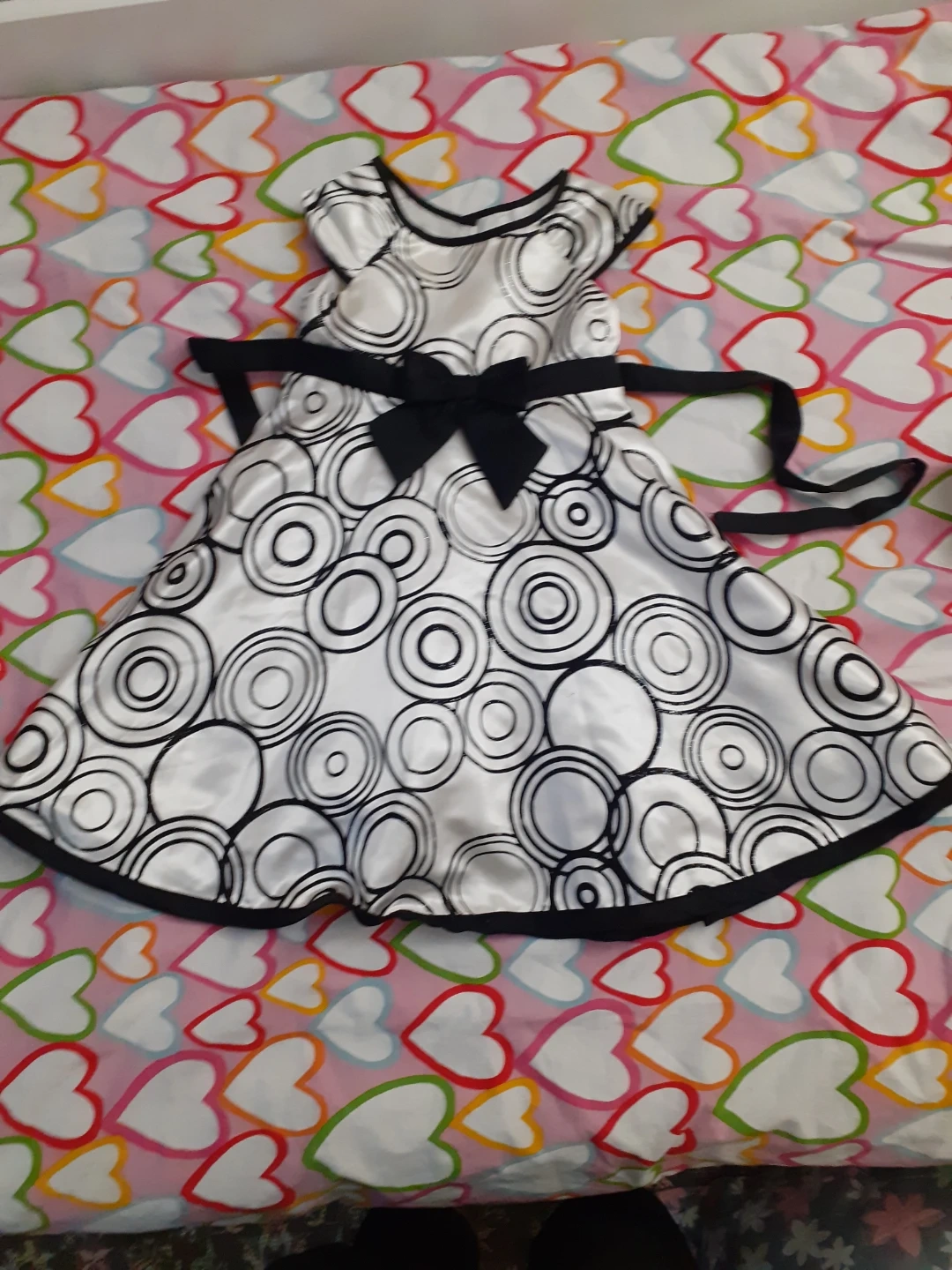 A collection of girls' clothing including two dresses and a pair of shorts. One dress is black with a lace collar, and the other is white with a black swirl pattern and a bow.