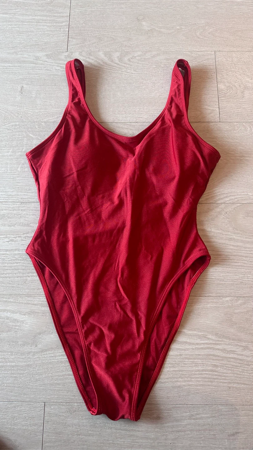 This is a classic red one-piece swimsuit with a flattering cut. It features adjustable straps for a comfortable fit. Made from a stretchy, shimmering fabric that catches the light beautifully. Perfect for a day at the beach or pool!