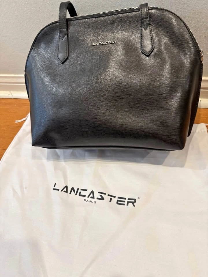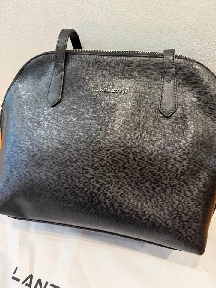 LANCASTER is a popular French high-end leather good brand. This is from their Smooth line, crafted from soft and smooth cowhide leather with a silky texture. It features zipped pockets inside and at the back, a cell-phone compartment, and a simple inside pocket. Dimensions: 32.0x28.0x15.0 cm. To clean, carefully rub the leather with a soft pale cloth using a suitable colorless and neutral cream, or gentle make-up remover. Small stains can be faded with a white eraser before applying cream.
