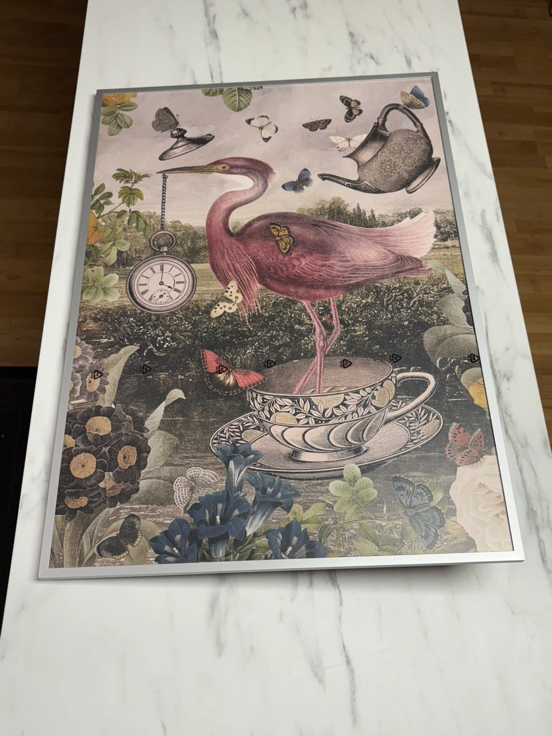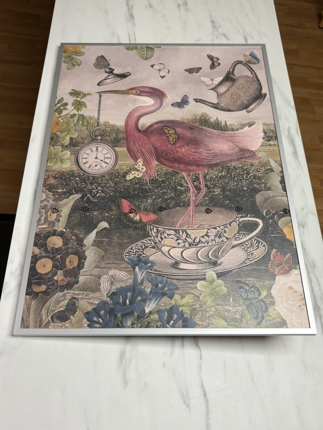 Beautiful framed collage print. Features a pink bird standing in a teacup surrounded by butterflies, flowers, and a pocket watch. Silver frame. Unique and whimsical artwork. Perfect for adding character to your home décor.