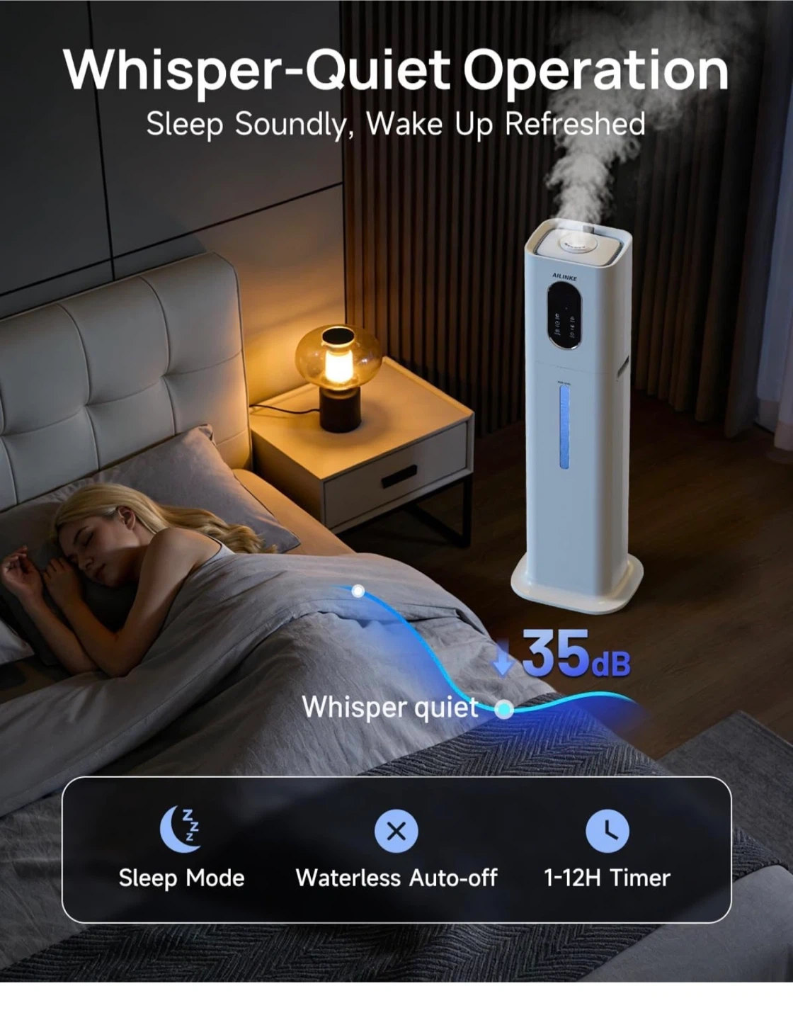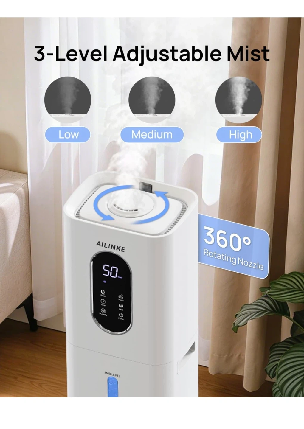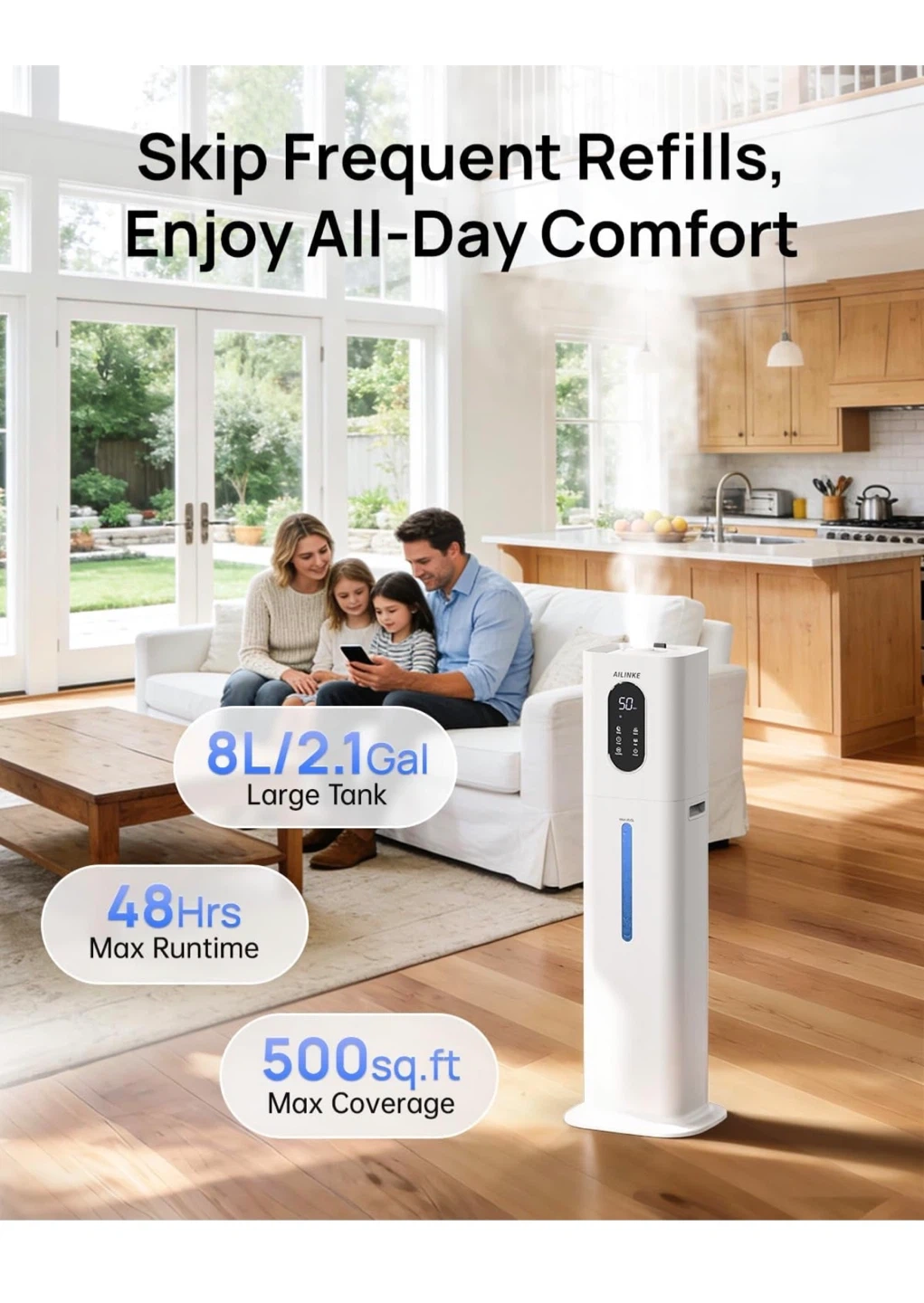 This AILINKE humidifier offers both warm and cool mist options for year-round comfort. It features an 8L/2.1Gal large tank with a max runtime of 48 hours and covers up to 500 sq ft. The unit provides 3-level adjustable mist output and a 360° rotating nozzle. It operates quietly at 35dB and includes sleep mode, waterless auto-off, and a 1-12H timer.