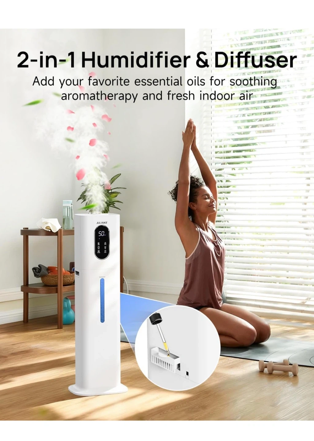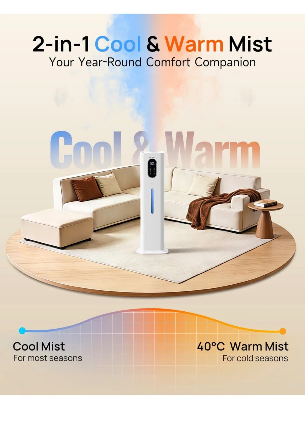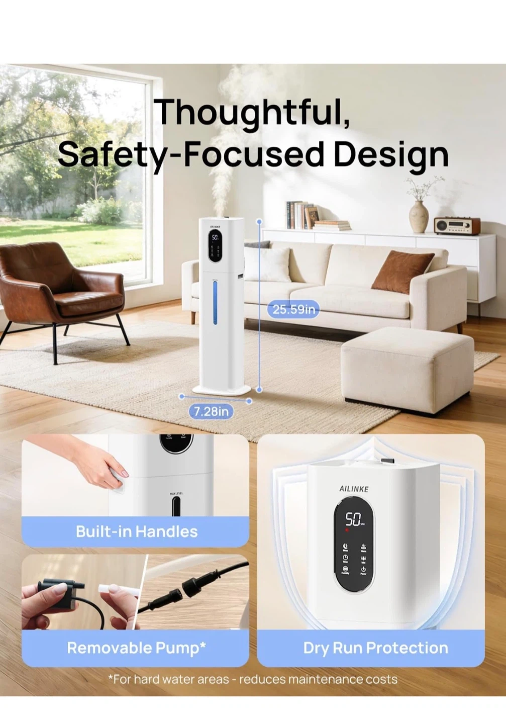 This AILINKE humidifier offers both warm and cool mist options for year-round comfort. It features an 8L/2.1Gal large tank with a max runtime of 48 hours and covers up to 500 sq ft. The unit provides 3-level adjustable mist output and a 360° rotating nozzle. It operates quietly at 35dB and includes sleep mode, waterless auto-off, and a 1-12H timer.