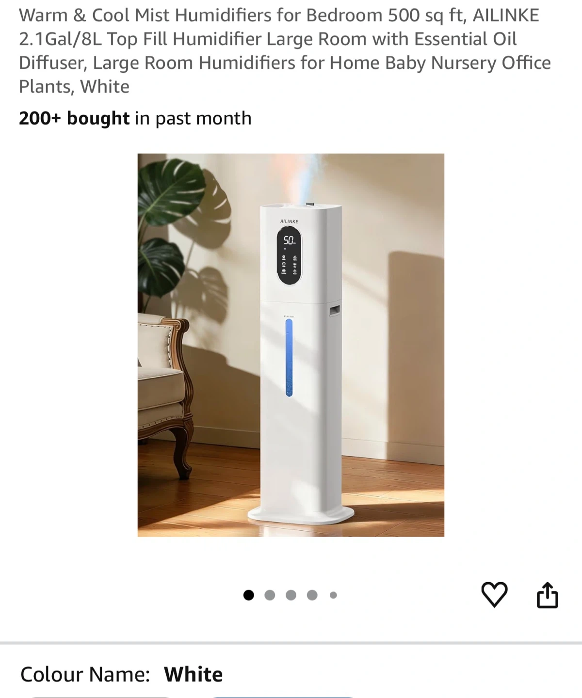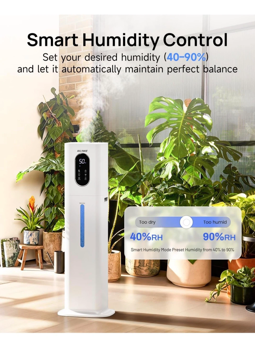 This AILINKE humidifier offers both warm and cool mist options for year-round comfort. It features an 8L/2.1Gal large tank with a max runtime of 48 hours and covers up to 500 sq ft. The unit provides 3-level adjustable mist output and a 360° rotating nozzle. It operates quietly at 35dB and includes sleep mode, waterless auto-off, and a 1-12H timer.