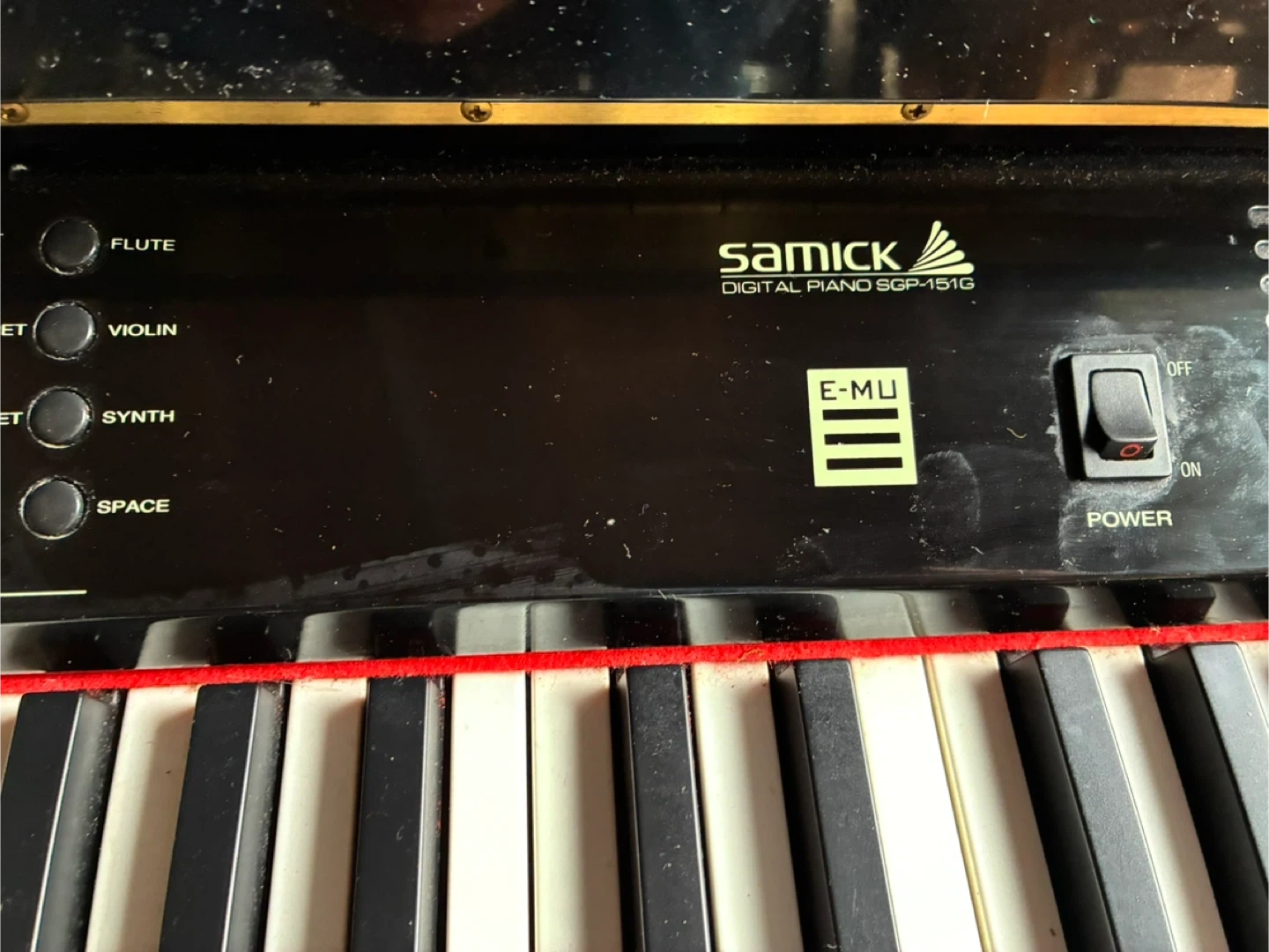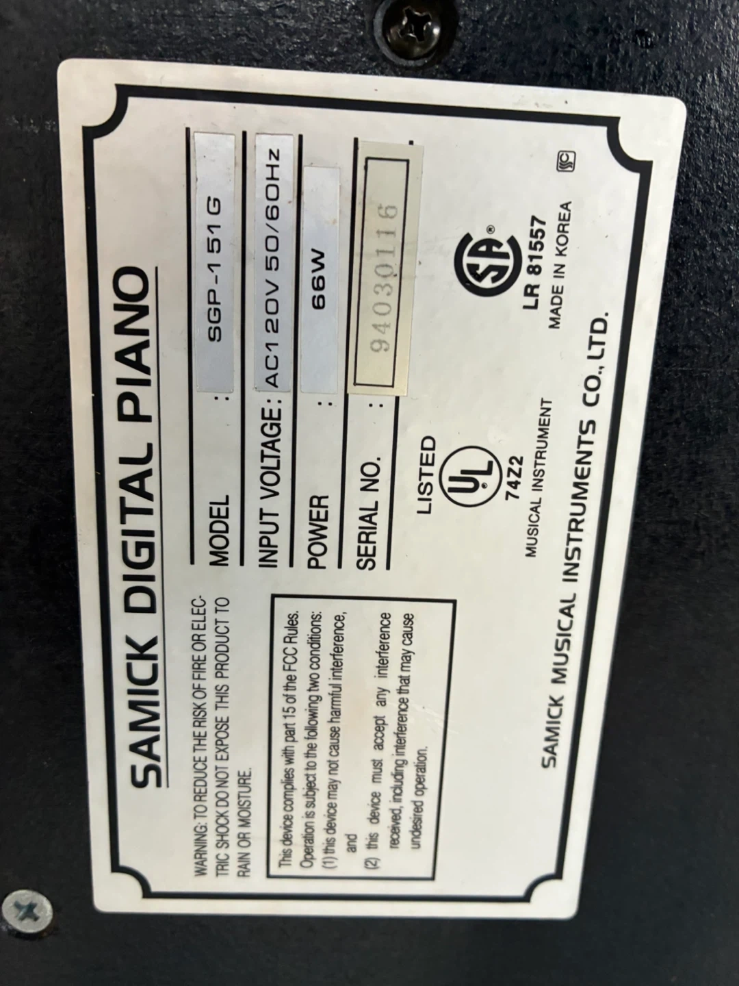 This is a Samick Digital Piano, model SGP-151G. It's black and features a full keyboard with various sound options. Power consumption is 66W.