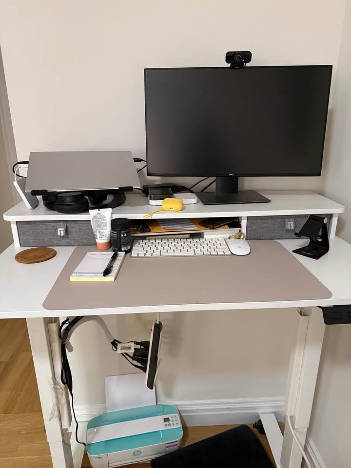 White standing desk with a storage shelf and two baskets included. Bought on Amazon used for three years in really good condition. It has wheels that lock in place. There’s a pad that can adjust the height of the desk and you can save height adjustments.