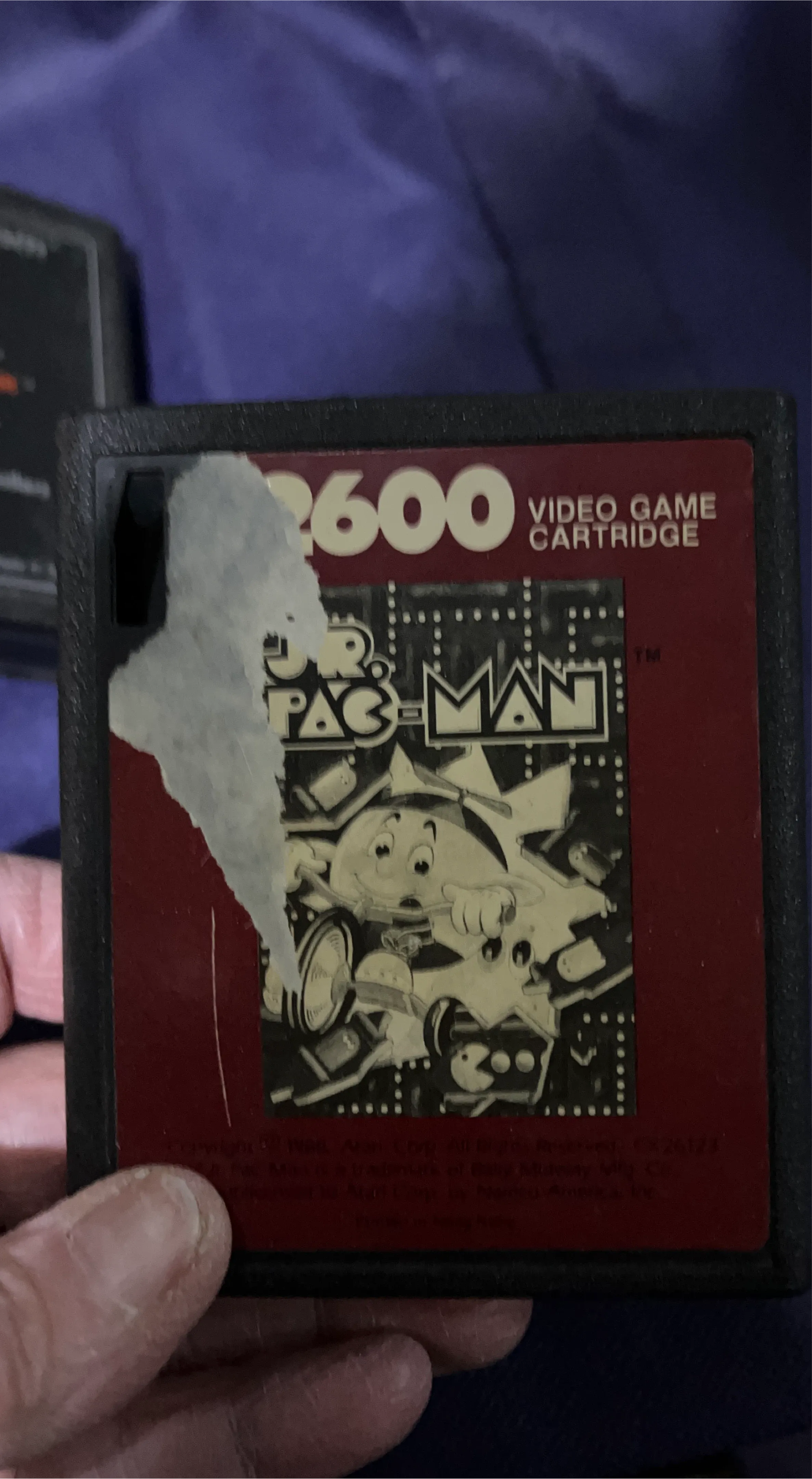 This is the Jr. Pac-Man video game cartridge for the Atari 2600. The label has some wear and tear. It's a classic arcade game experience for the Atari.