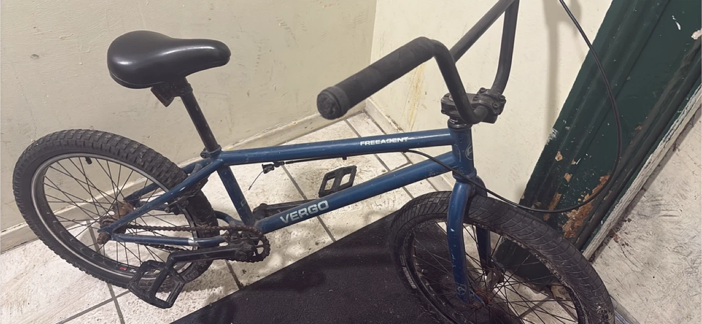 Blue Free Agent Vergo BMX bike. It's a sturdy bike built for stunts and tricks. Ideal for riders looking for a reliable BMX.