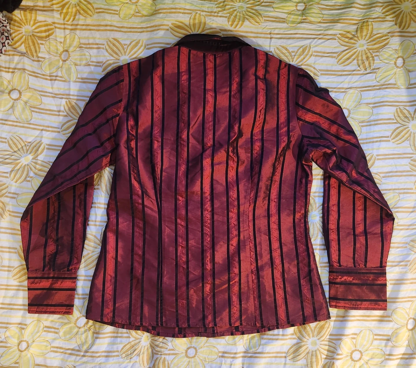 super cool shiny red and black pin-stripe blouse with ruffles by the brand Puli. a 90s whimsigoth or vampire classic, so Spike btvs!
