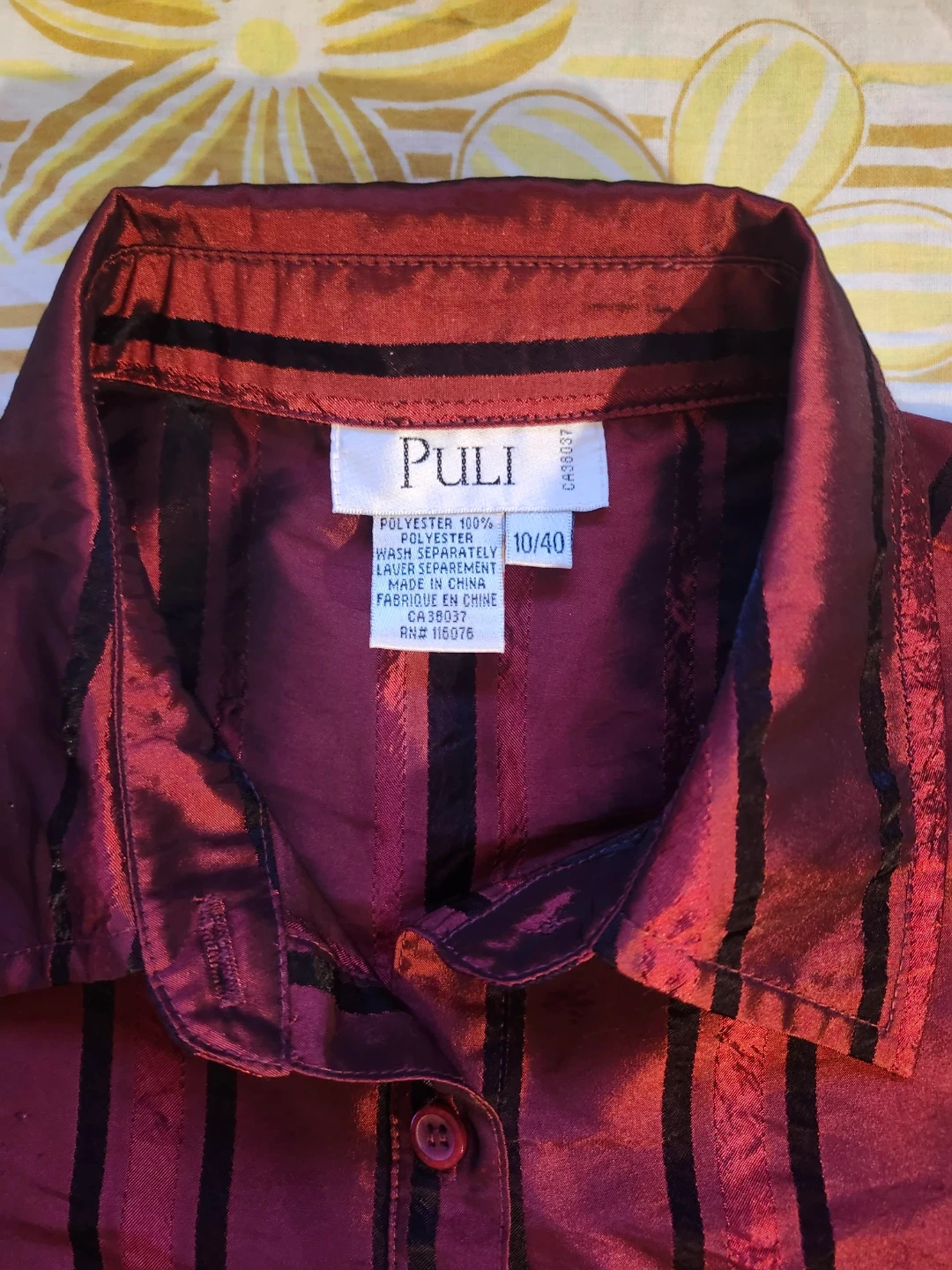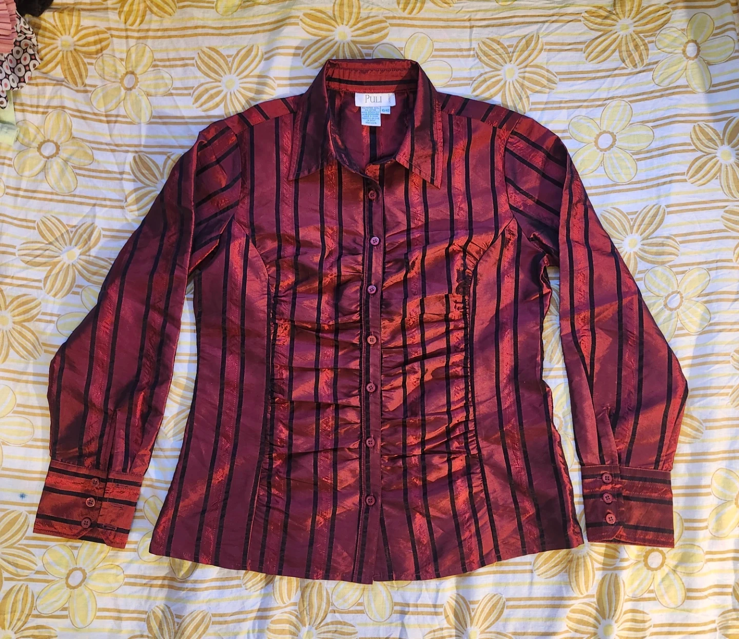 super cool shiny red and black pin-stripe blouse with ruffles by the brand Puli. a 90s whimsigoth or vampire classic, so Spike btvs!