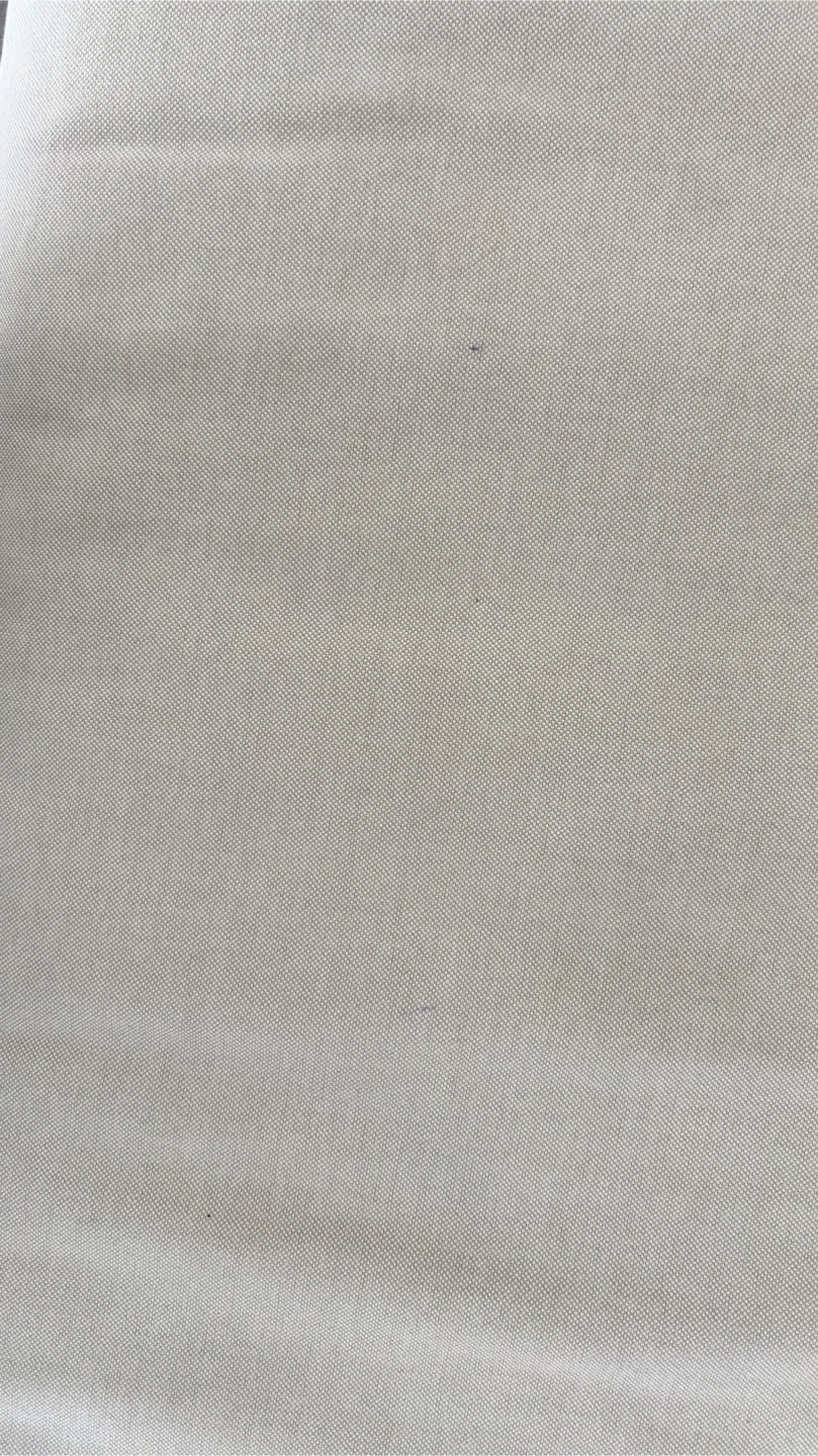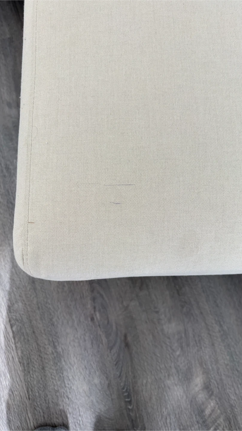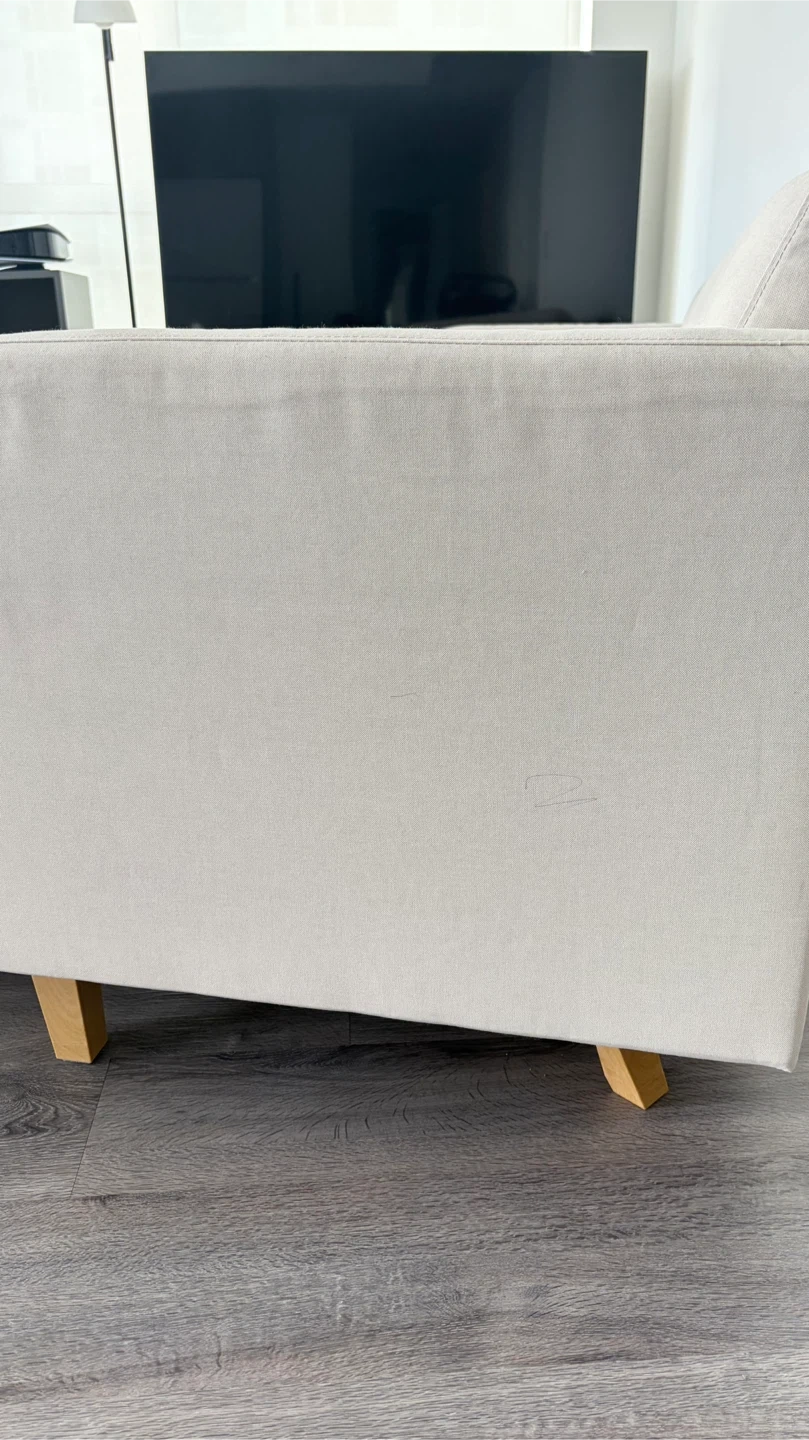 This comfortable sofa features a chaise for extra lounging. It's upholstered in a light beige fabric with wooden legs. A few faint marks are present on the fabric, but overall it's in good condition.