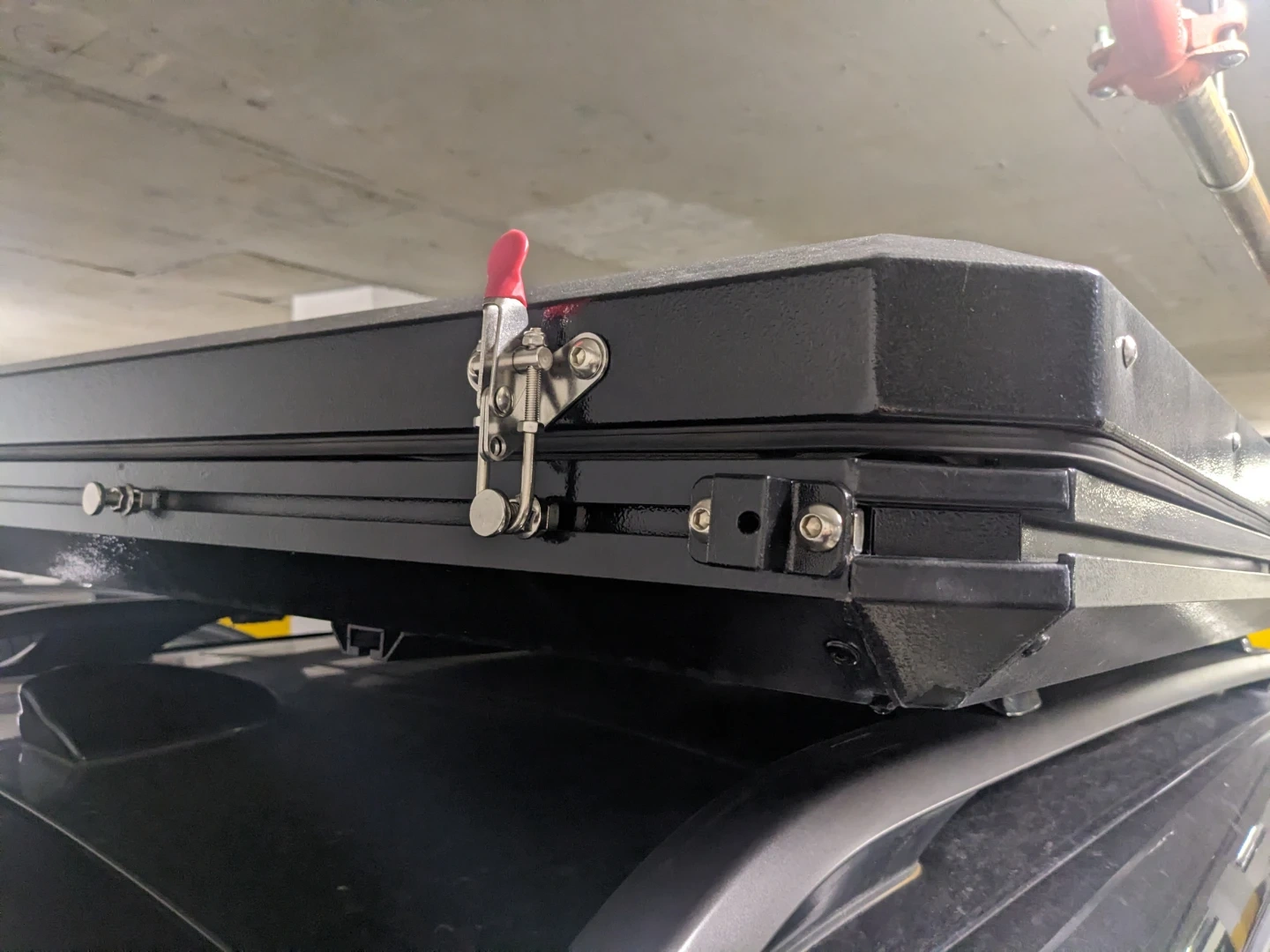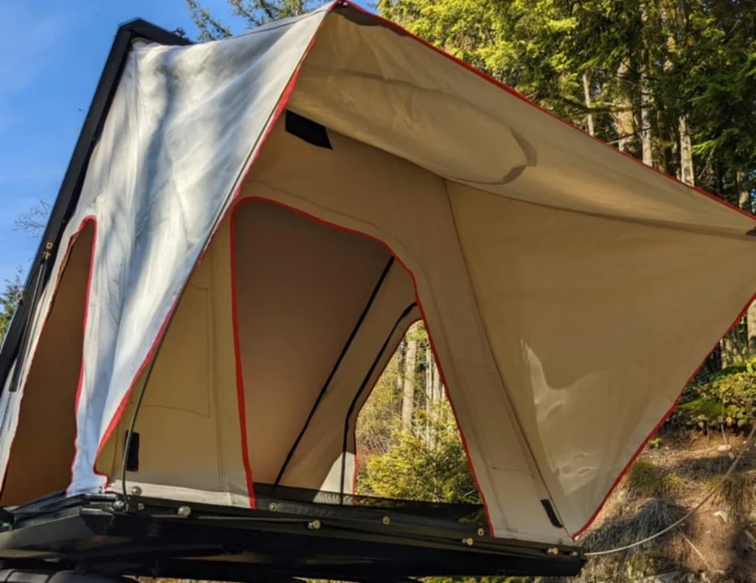 Selling a roof top tent perfect for camping adventures! It's in like-new condition (used once) and ready for your next outdoor trip. Hard shell wedge-style aluminum tent 210x140x16cm LxWxH. Comes with ladder, mattress, anti-condensation mat, storage net, shoe bag. Fits three plus a small child or pet.
