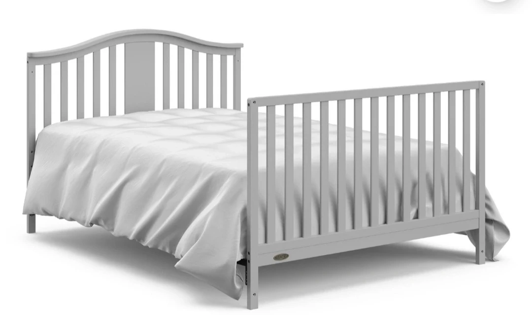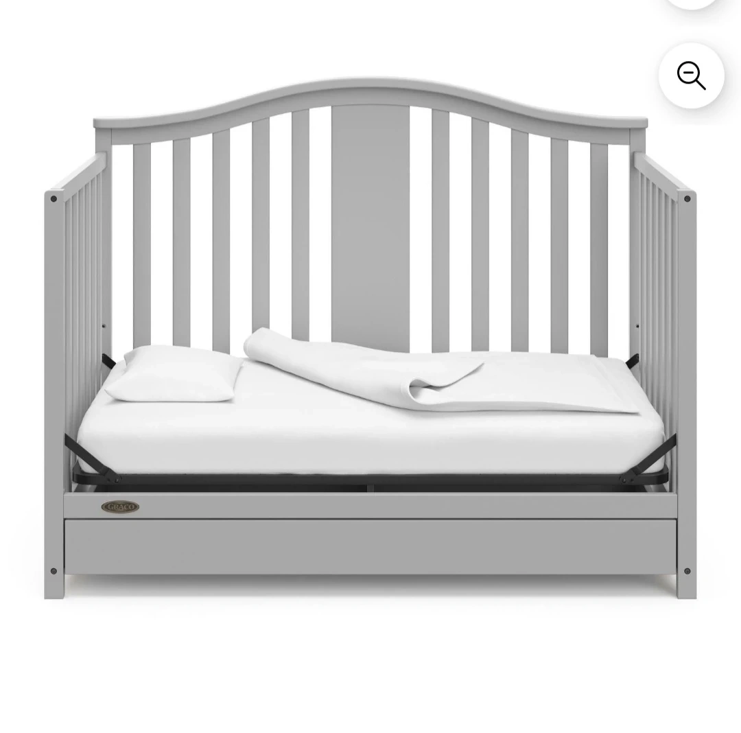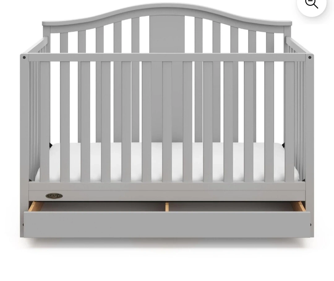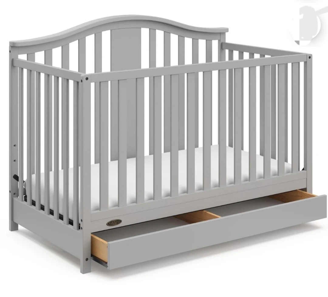 This is a grey Graco convertible crib. It has a built-in drawer for extra storage. It converts to a toddler bed and a daybed.