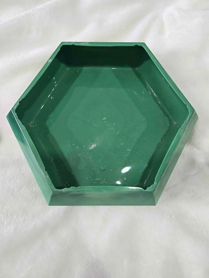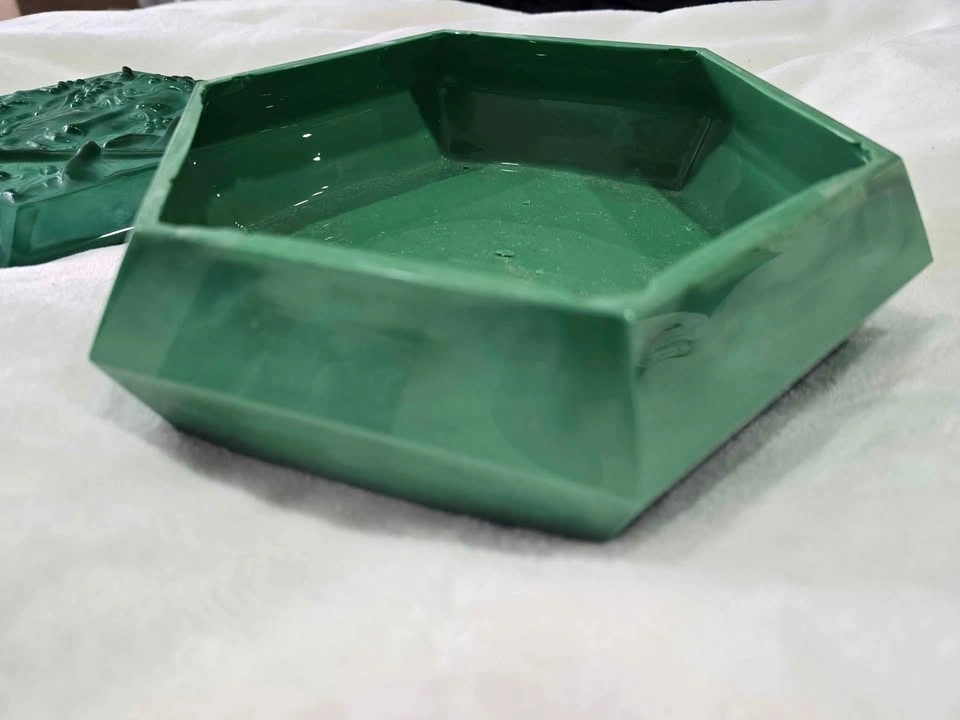 This is a unique, large trinket box in a beautiful jade green color, perfect for a collector. It measures approximately 8.5" across and about 3.5" in height. Please see all additional photos for detail. There are some chips on the inside rim, as shown in the photos, but they do not detract from the uniqueness of this piece. I purchased this years ago at auction. Located in the Weston area near Logan and Keewaiten. Smoke-free home.