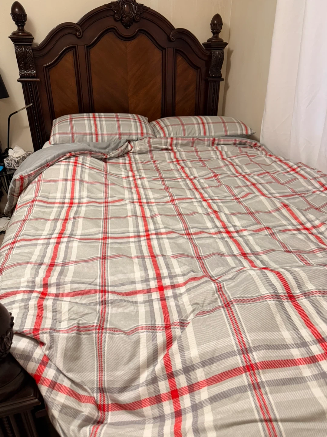 A stylish dark wood bedroom furniture set featuring a headboard, dresser with mirror, and a nightstand. It's made of rich, dark wood with ornate detailing. This set includes a matching bedding set with a plaid pattern. The dresser has ample drawer space for storage.