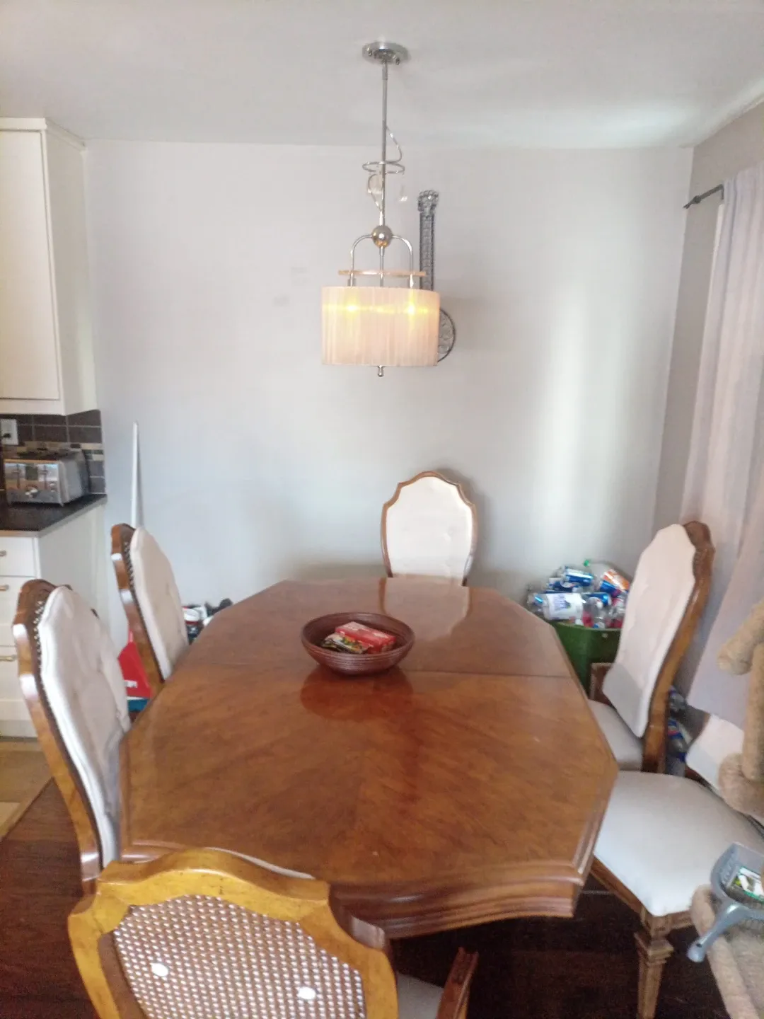 Selling a dining table with six chairs. The table is wooden and has a unique design. The chairs have white cushions and wooden frames. Perfect for family dinners!
