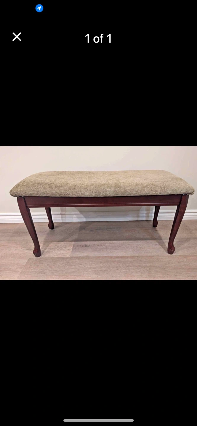 Selling a lovely upholstered bench with dark wood legs. It's in great condition and would be a nice addition to any room!