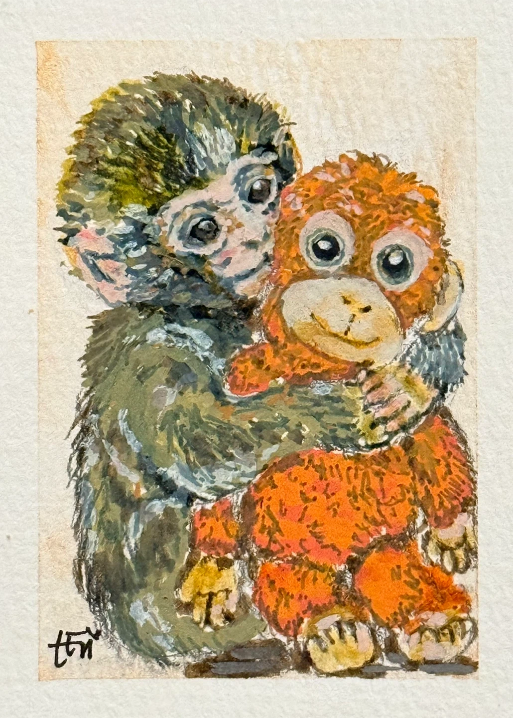 Miniature mixed media art card depicting Punch the monkey and his friend best friend. Acrylics, Ink and Watercolour on 2.5”X3.5” watercolour paper.